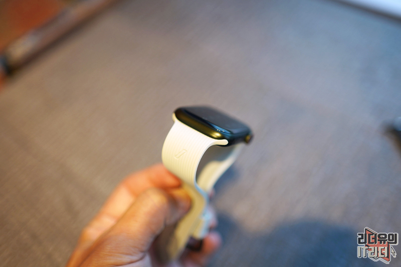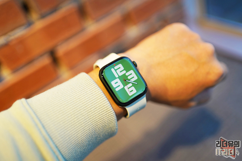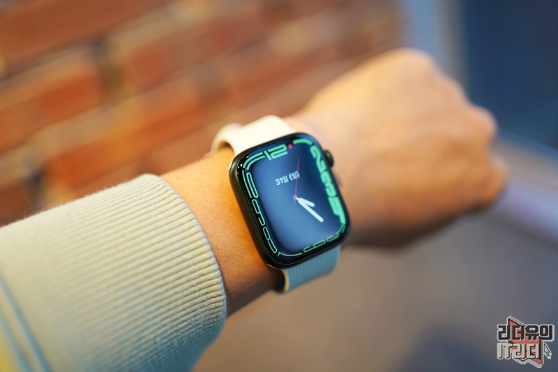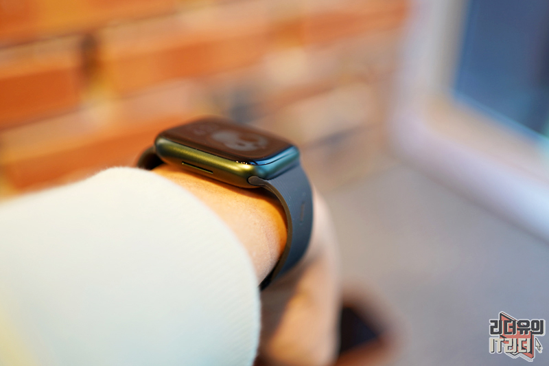 애플워치7에 완벽하게 장착된 모습입니다. 참고로 애플워치7 그린 색상인데요. 밝은 색상의 네이티브 유니온 커브 스트랩 세이지 색상이지만 잘 어울립니다. 어두운 계열의 애플워치도 잘 어울리는 애플워치 밴드입니다.