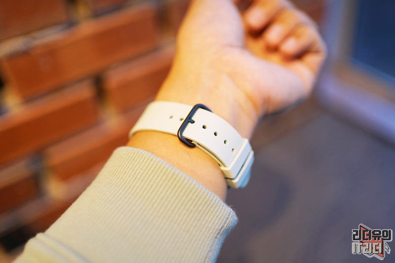 밴드 체결하는 부분의 버클은 메탈로 되어 있고 라운딩이 들어간 고급스러운 디자인이 적용되어 있습니다.