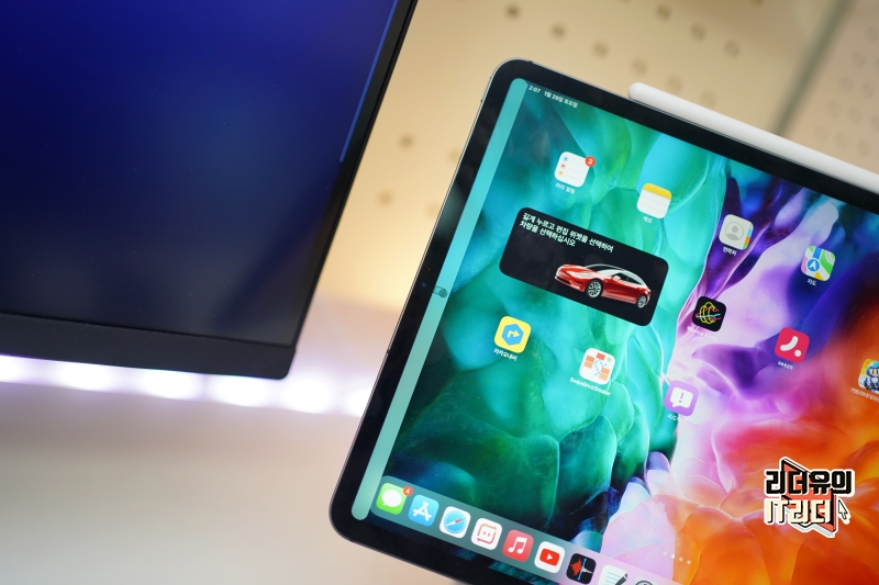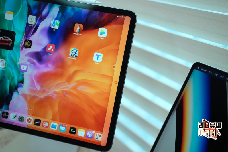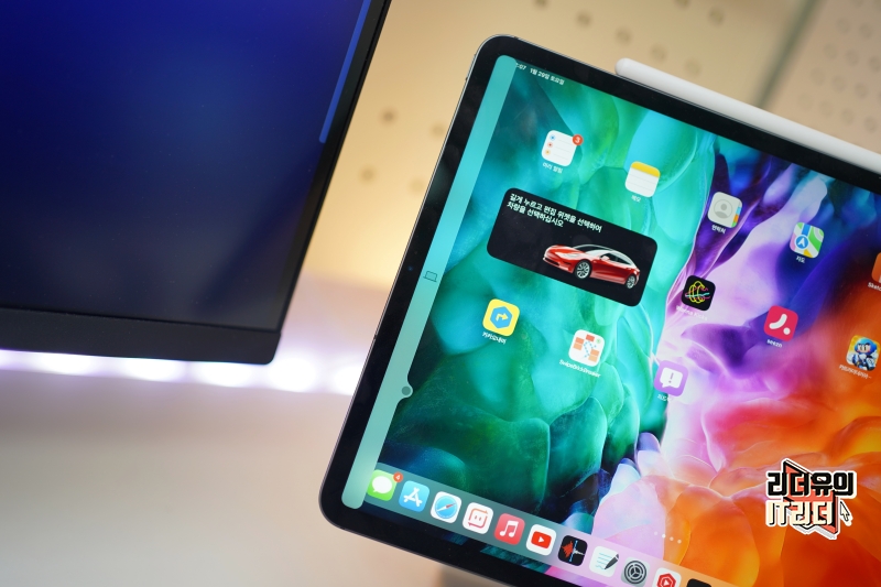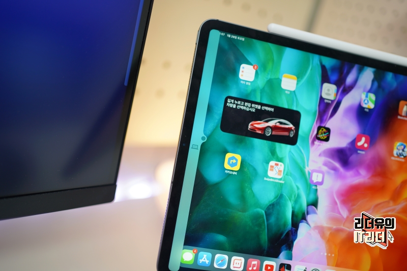 그리고 아이패드 프로 12.9에도 하얀색바가 나옵니다. 여기서 중요한 포인트는 연결되는 방향으로 아이패드에도 바가 해당 방향으로 표시된다는 것입니다.