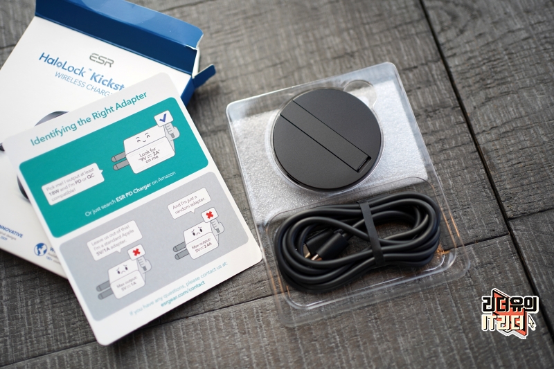 개봉을 한 모습입니다. 어댑터는 포함되지 않기 때문에 9V 2A (18W) 이상 어댑터를 사용할 것을 권장하고 있습니다. 그럼 최대 7.5W로 아이폰 맥세이프 충전을 할 수 있습니다.