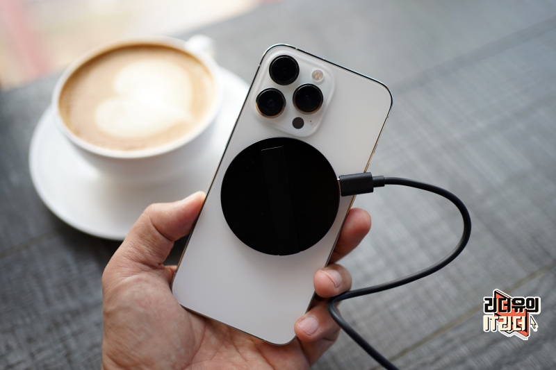 맥세이프 충전기로 아이폰13 프로에 부착한 모습입니다. 자석 방식이라 너무나 간편한 연결이 좋습니다.