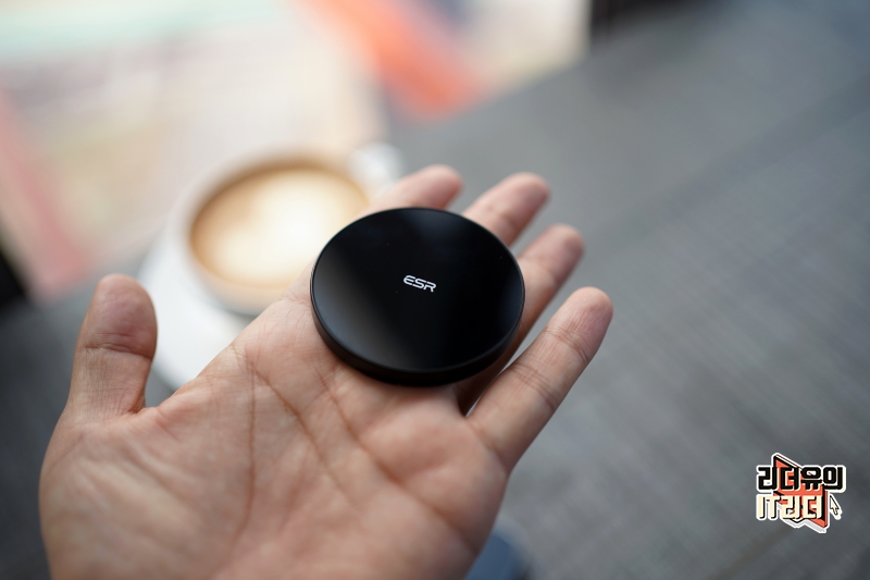 ESR 할로락 킥스탠드 맥세이프 무선충전 거치대는 컴팩트한 사이즈이고 맥세이프 형태에 맞는 원형 디자인입니다. 그리고 하이그로시한 반짝 거리는 면을 가지고 있고 가운데 ESR 로고가 들어가 있습니다. 참고로 사이즈는 지름 60mm, 두께 6mm 무게는 43g으로 휴대하기에도 부담없는 사이즈와 무게입니다.