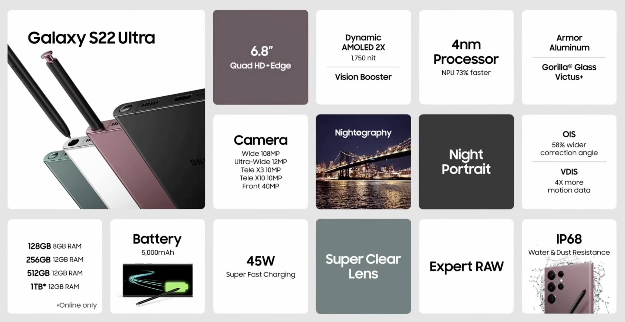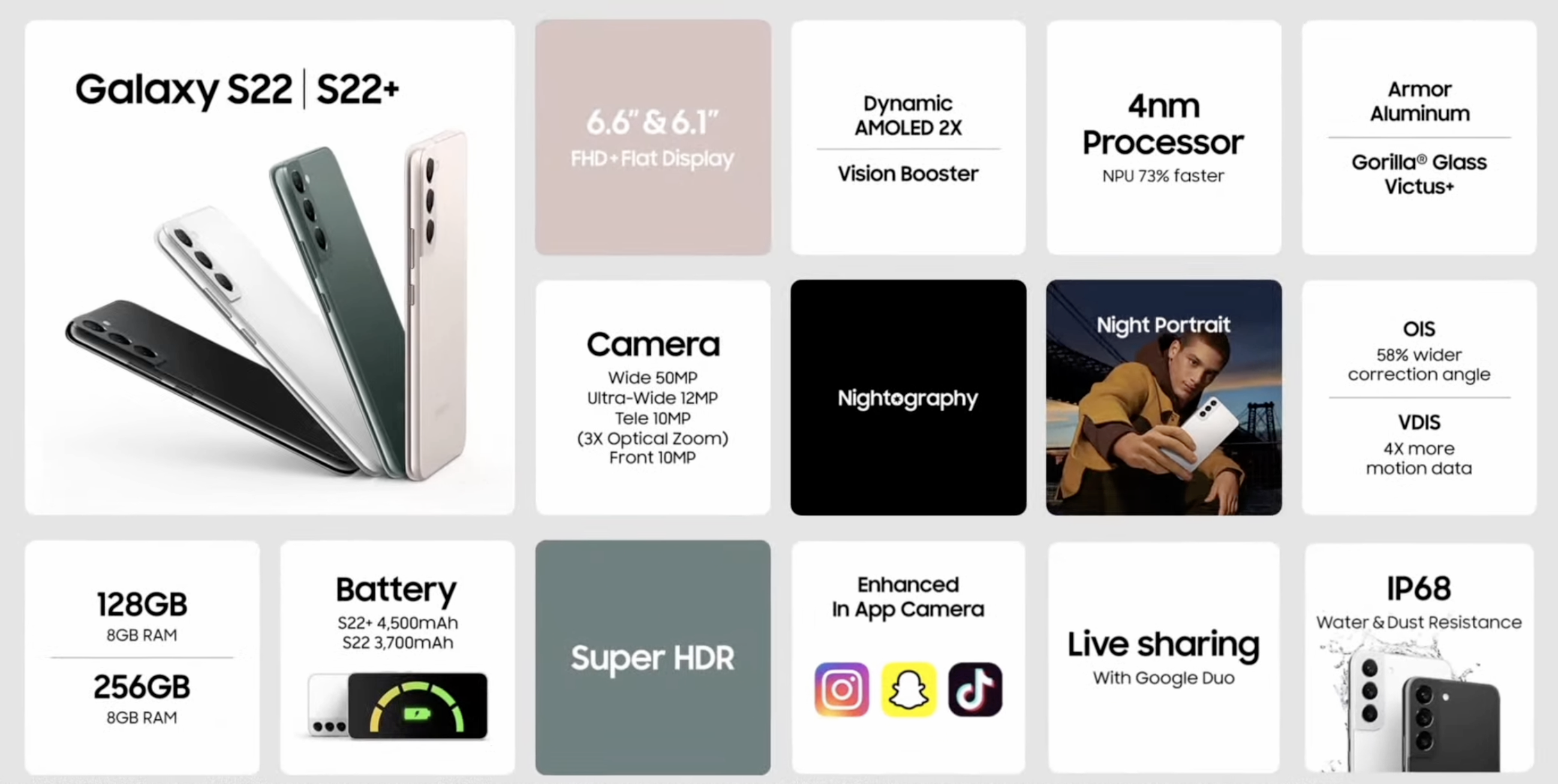 갤럭시S22 울트라, 갤럭시S22 플러스, 갤럭시S22는 갤럭시S 시리즈 최초로 아머 알루미늄(Armor Aluminum)을 적용해 더욱 강력한 내구성을 가지고 있고 스마트폰 최초로 코닝 고릴라 글래스 빅투스 플러스를 전후면 모두 적용해 가장 강력한 갤럭시S 스마트폰이 되었습니다.