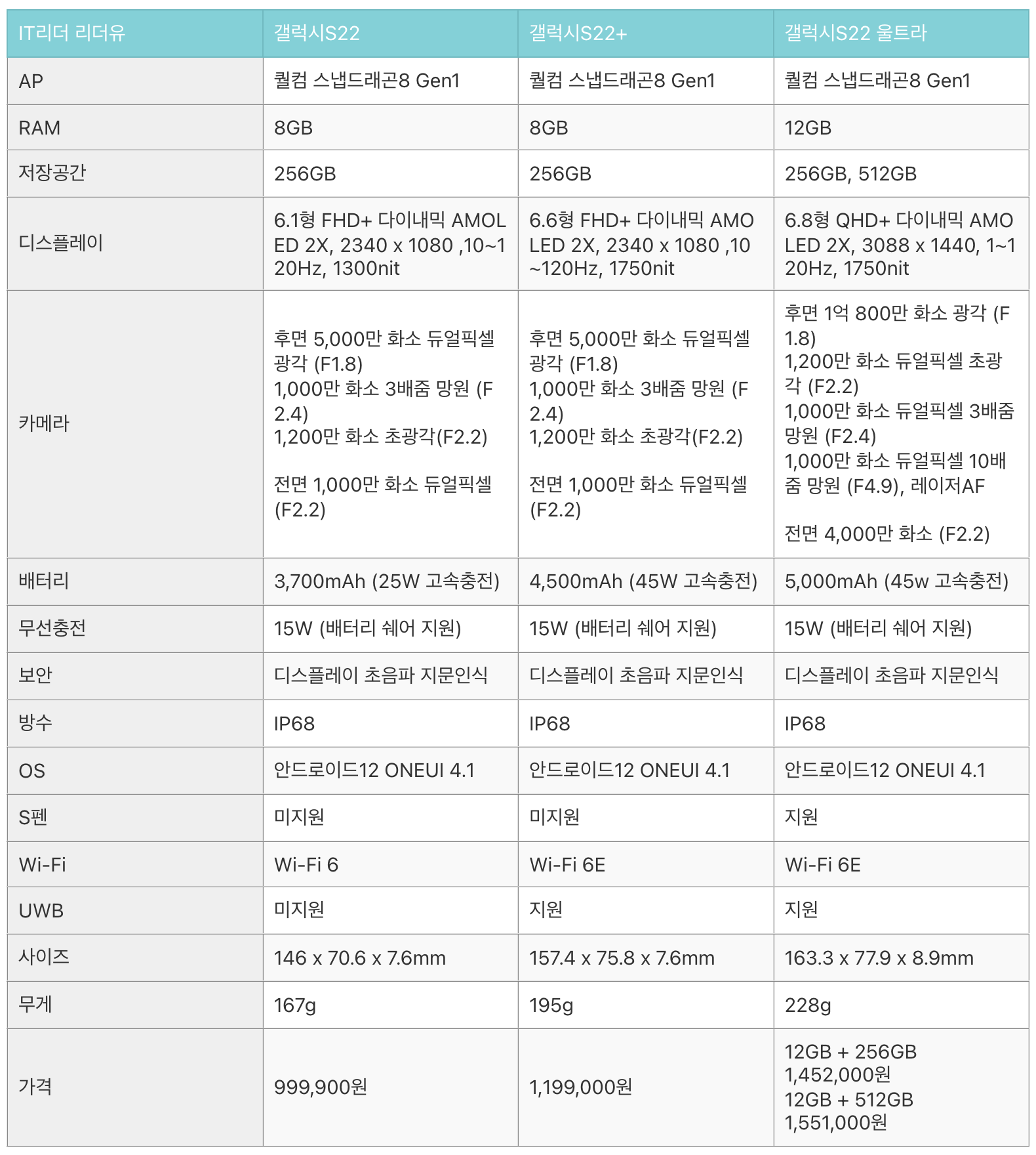 갤럭시S22 울트라, 갤럭시S22 플러스, 갤럭시S22 스펙 비교