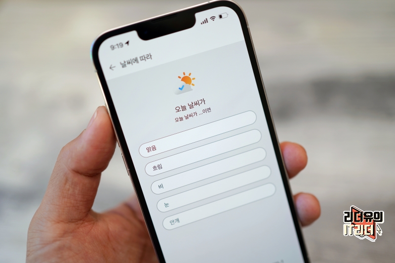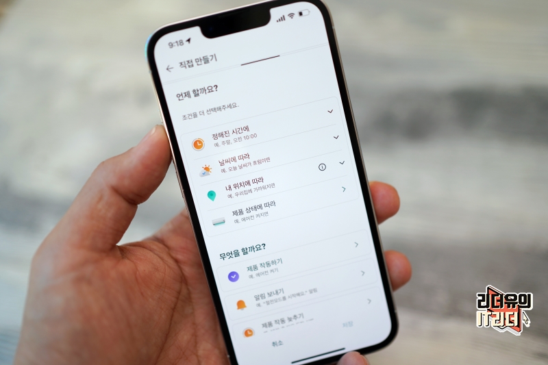 이런 상황 설정은 다양한 조건과 동작을 설정할 수 있습니다. 리더유 홈에 가까워지면 10분 후 자동화를 시작해요 등등 다양한 상황 조건을 만들 수 있습니다.