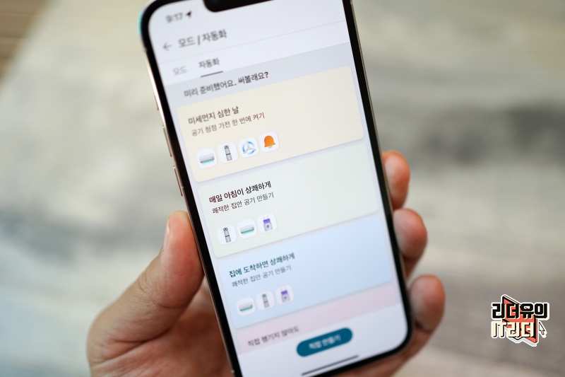 자동화는 상황에 맞게 자동으로 가전이 컨트롤 되는 기능입니다. 공기가 안좋을 경우(미세먼지 심한 날) 관련 기기들을 묶어 한번에 작동하게 할 수 있고 아침 시간에 쾌적한 하루를 시작할 수 있도록 공기정화를 하거나 집에 도착했을 경우 알아서 공기청정기를 켜주고 스마트 플러그를 통해 알아서 작동되게 할 수도 있습니다.