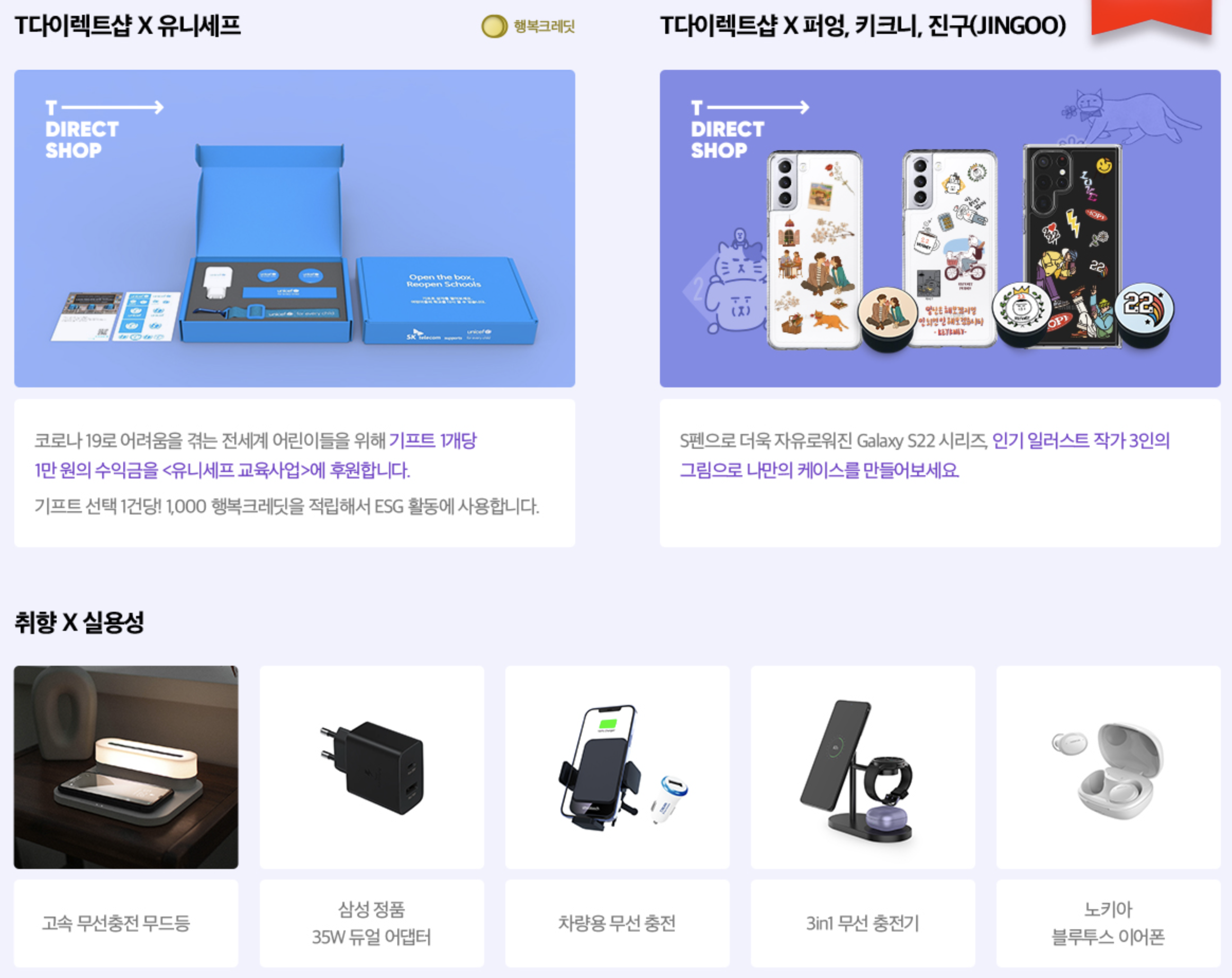 T다이렉트샵에서 구입을 하면 선택으로 T다이렉트샵 X 유니세프 액세서리 또는 T다이렉트샵 X 퍼엉, 키크니, 진구 액세서리, 고속 무선충전 무드등, 삼성 정품 35W 듀얼 어댑터, 차량용 무선 충전, 3in1 무선 충전기, 노키아 블루투스 이어폰 중 하나를 선택해서 받을 수 있습니다. 종류는 다양하니 골라서 받으시면 됩니다.
