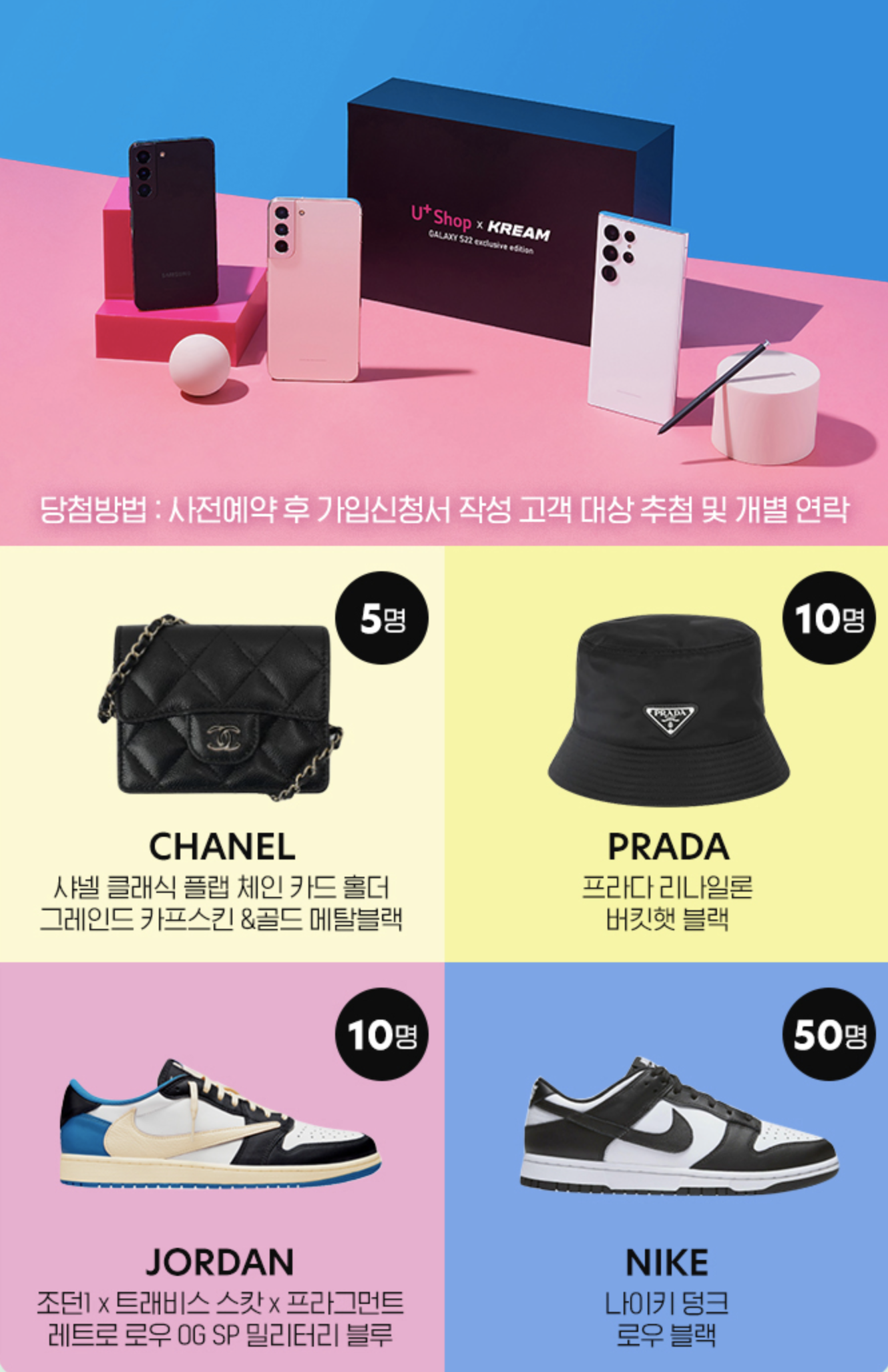 유플러스 갤럭시S22 사전예약 후 가입신청서 작성 고객 대상으로 추첨을 해서 한정판을 함께 제공하는 이벤트를 하고 있습니다. 샤넬 클래식 플랩 체인 카드 홀드 그레인드 카프스킨 & 골드 메탈 블랙 5명, 프라다 리나일론 버킷햇 블랙, 조던1 x 트래비스 스캇 x 프라그먼트 레트로 로우 OG SP 밀리터리 블루 10명, 나이키 덩크 로우 블랙 50명을 추첨해 제공합니다.
