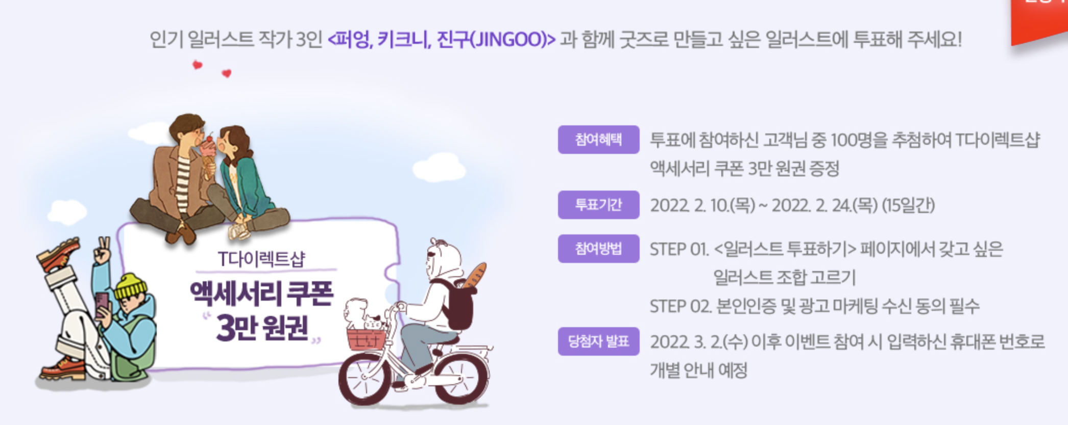 인기 일러스트 작가 3인 퍼엉, 키크니, 진구와 함께 굿즈로 만들고 싶은 일러스트에 투표하는 이벤트를 통해 100명을 뽑아 액세서리 쿠폰 3만 원권을 증정한다고 합니다. 겨우 100명이라 선정 가능성은 많이 낮아 보입니다.