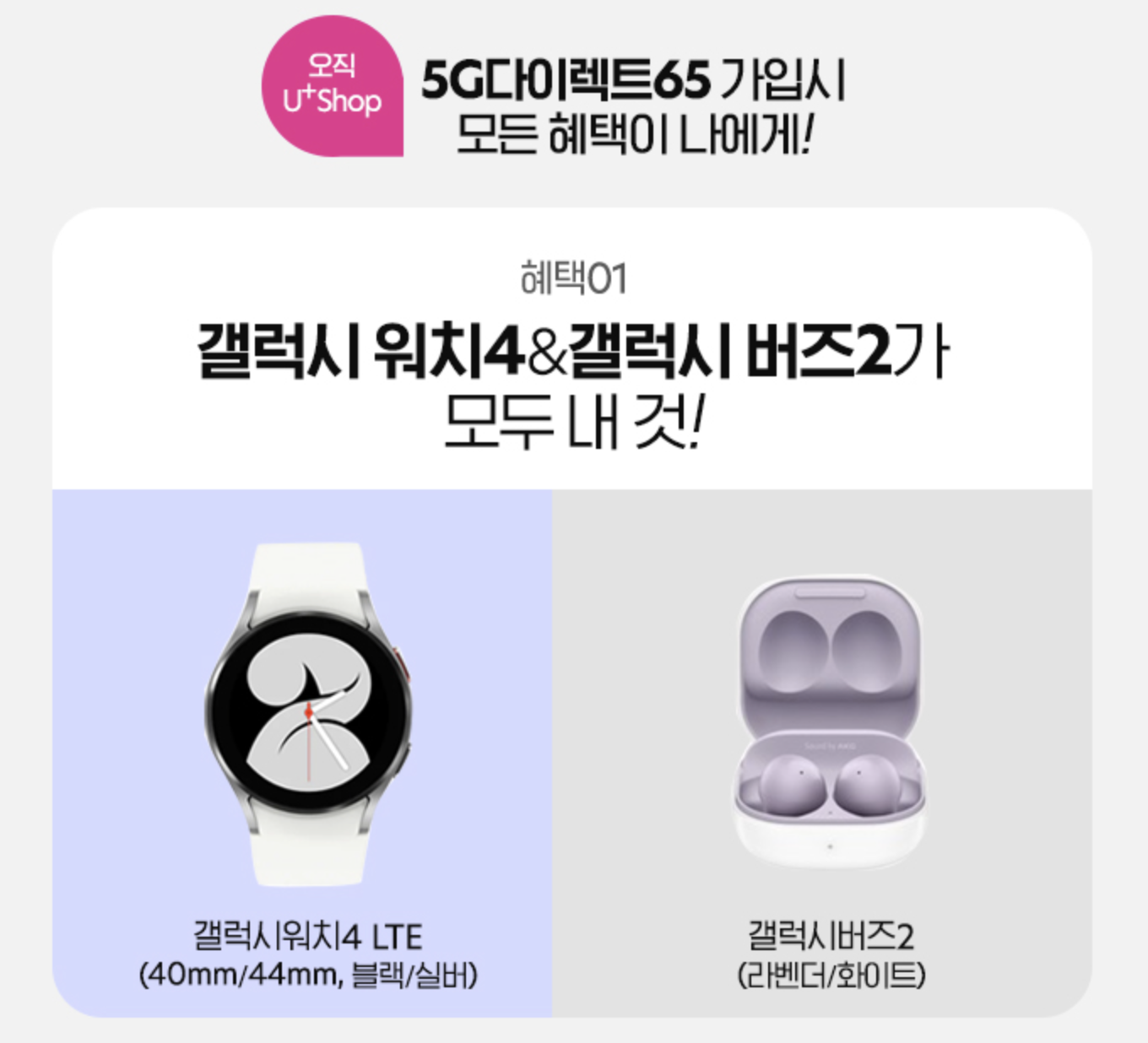 유플러스 샵에서 5G 다이렉트 65 가입을 하면 갤럭시워치4 LTE, 갤럭시 버즈2를 제공한다고 합니다. 5G 다이렉트 65 요금은 65,000원 입니다.