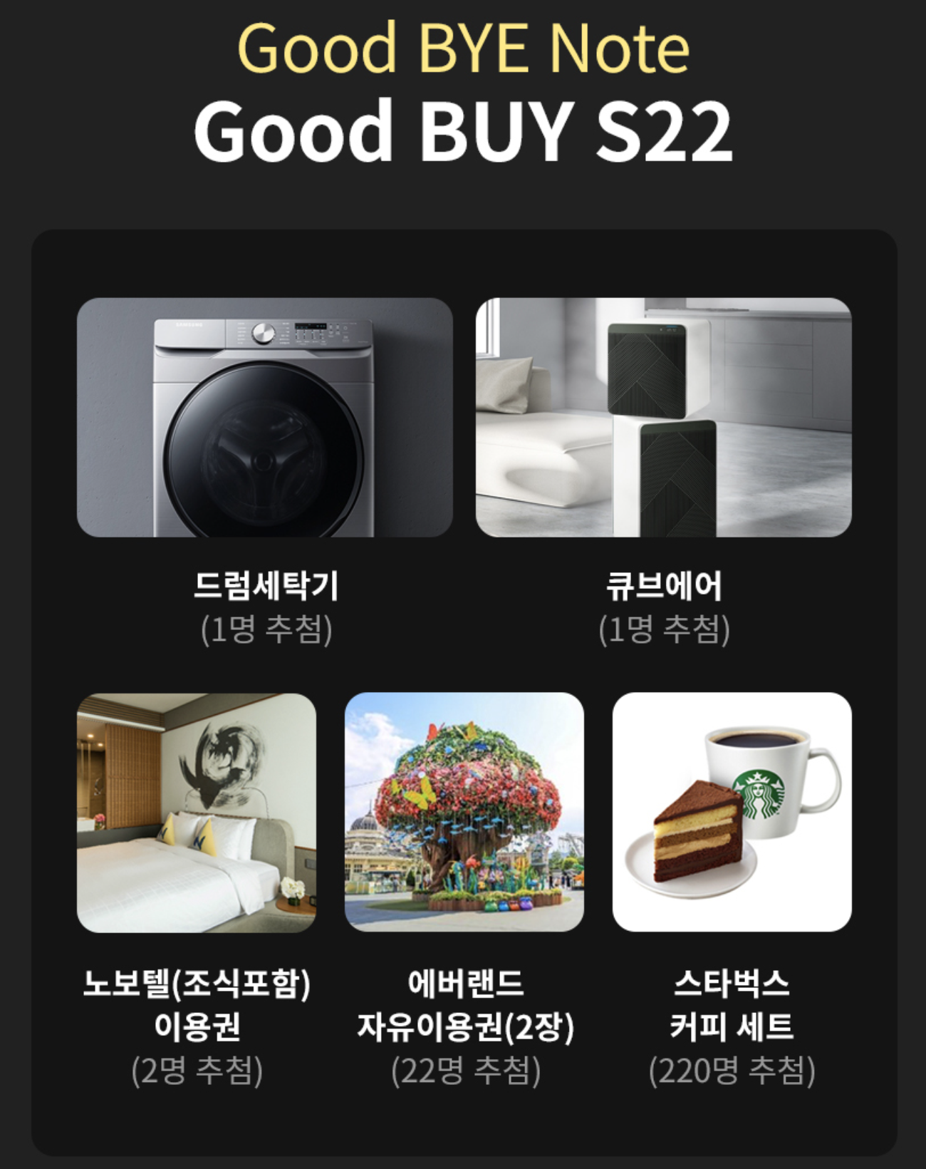 KT Shop에서는 기존 KT 갤럭시노트 고객 중 갤럭시S22 기변을 하면 추첨을 해서 드럼세탁기 1명, 큐브에어 1명, 노보텔 이용권 2명, 에버랜드 자유이용권 22명, 스타벅스 커피 세트 22명을 추첨해서 줍니다.