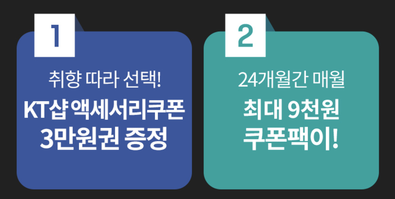KT 갤럭시S22 사전예약을 한 모두에게 KT샵 액세서리쿠폰 3만원을 증정한다고 합니다. 그리고 24개월간 매월 최대 9천원 쿠폰팩을 강조하고 있습니다.