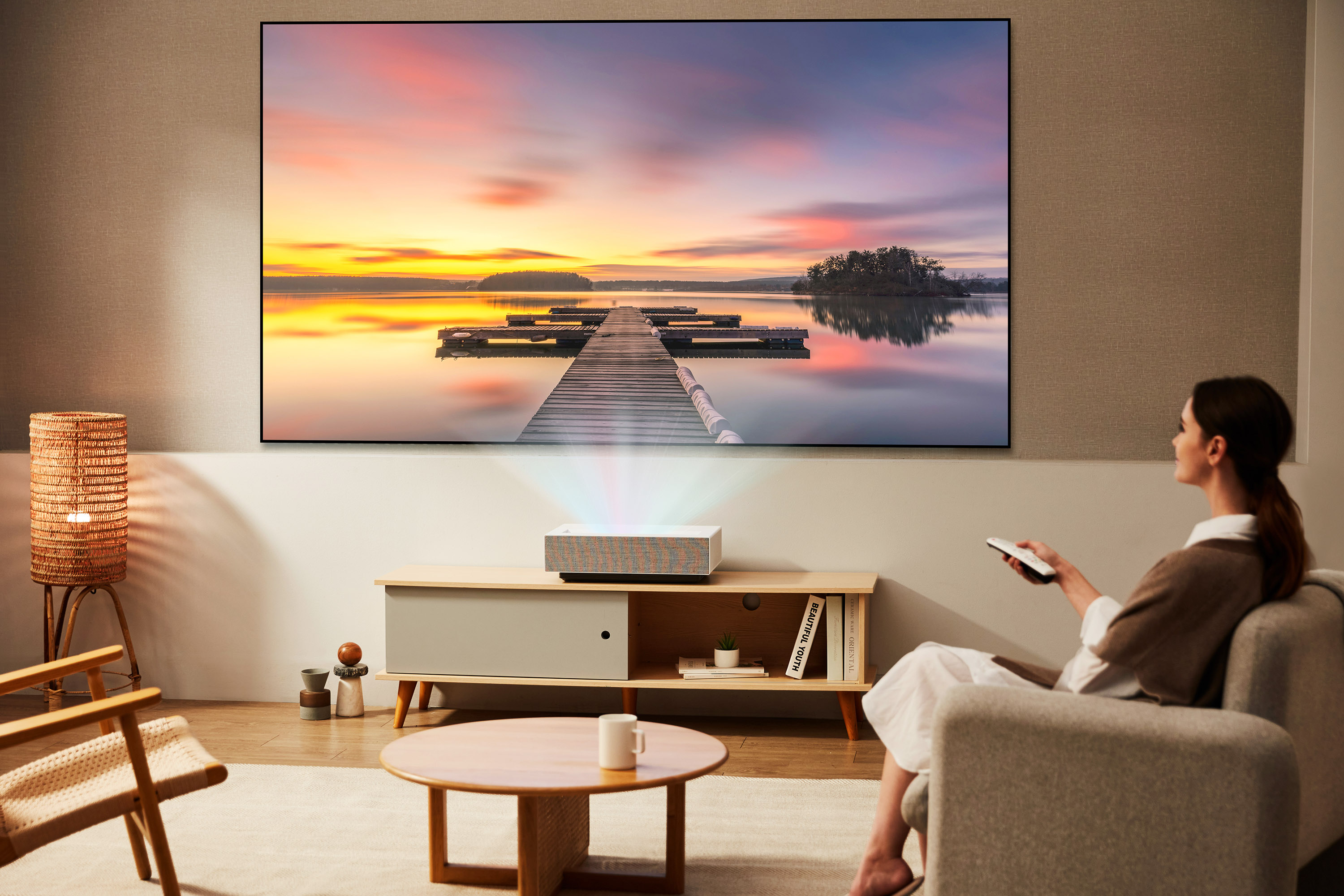 무엇보다 디자인 경쟁력이 좋습니다. 일반적인 빔프로젝터에서는 볼 수 없는 고급스러운 소재를 사용했는데요. 코튼화이트 색상은 본체 전면부에 명품 패브릭 브랜드 크바드라트(Kvadrat)를 적용했습니다. 크바드라트 색상도 그레이, 핑크, 그린 3가지 색상을 선택할 수 있어 인테리어 컨셉에 맞게 사용할 수 있습니다.