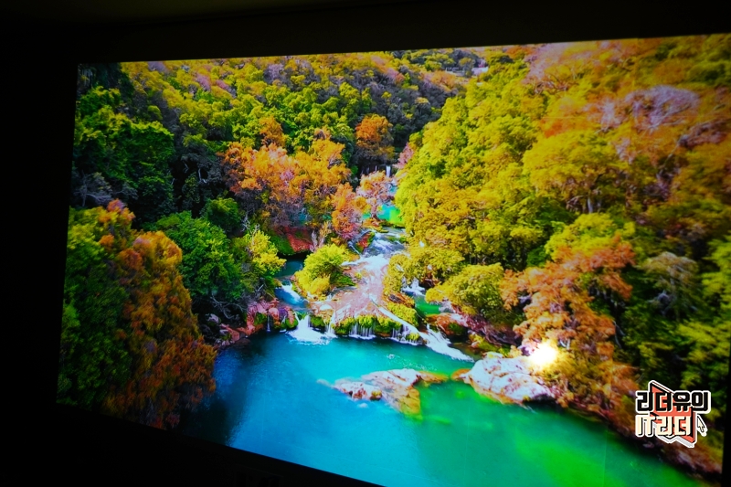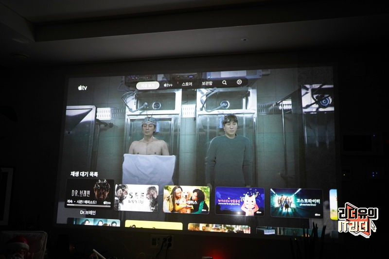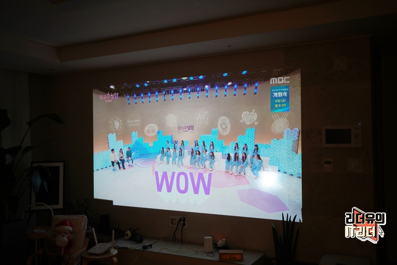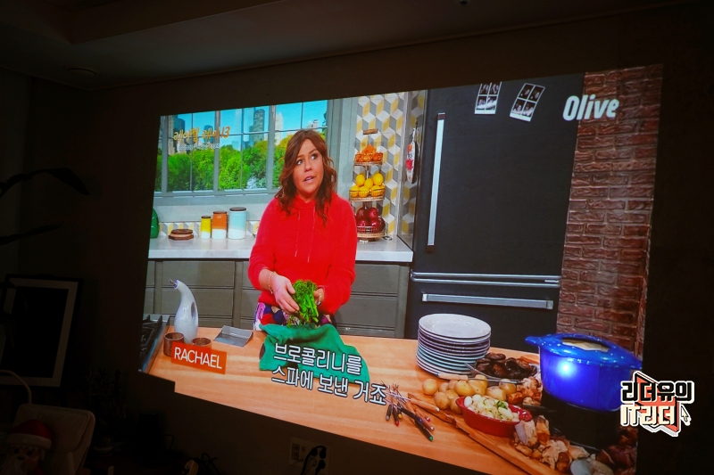 IPTV를 연결해 방송을 보는 모습입니다. 대형 TV를 보는 느낌인데요. RGB+BP 4채널 LED 광원을 사용해 일반 LED 프로젝터에 비해 더 높은 밝기와 색상을 보여주고 있습니다.