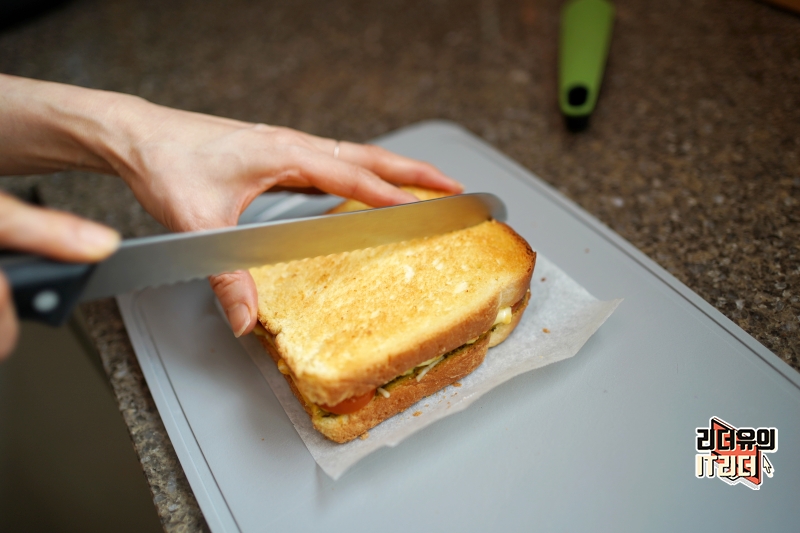 너무나 예쁘게 구워진 토스트! 바삭 거리는 자를때의 느낌도 너무나 좋았습니다.