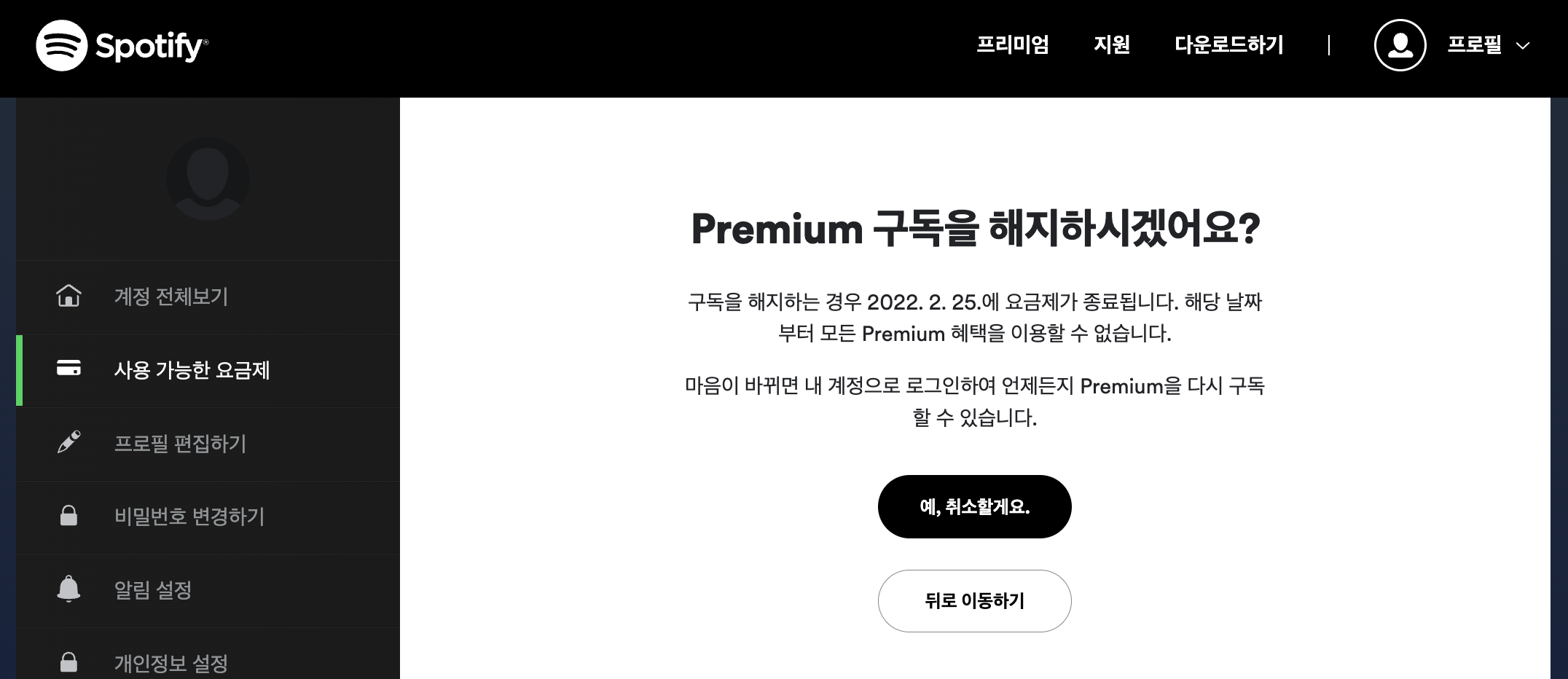 스포티파이 해지를 할 것인지 한번 더 확인하는 절차를 거친후 바로 해지가 됩니다. 해지 못하게 꼼수 부리지 않으니 좋습니다.