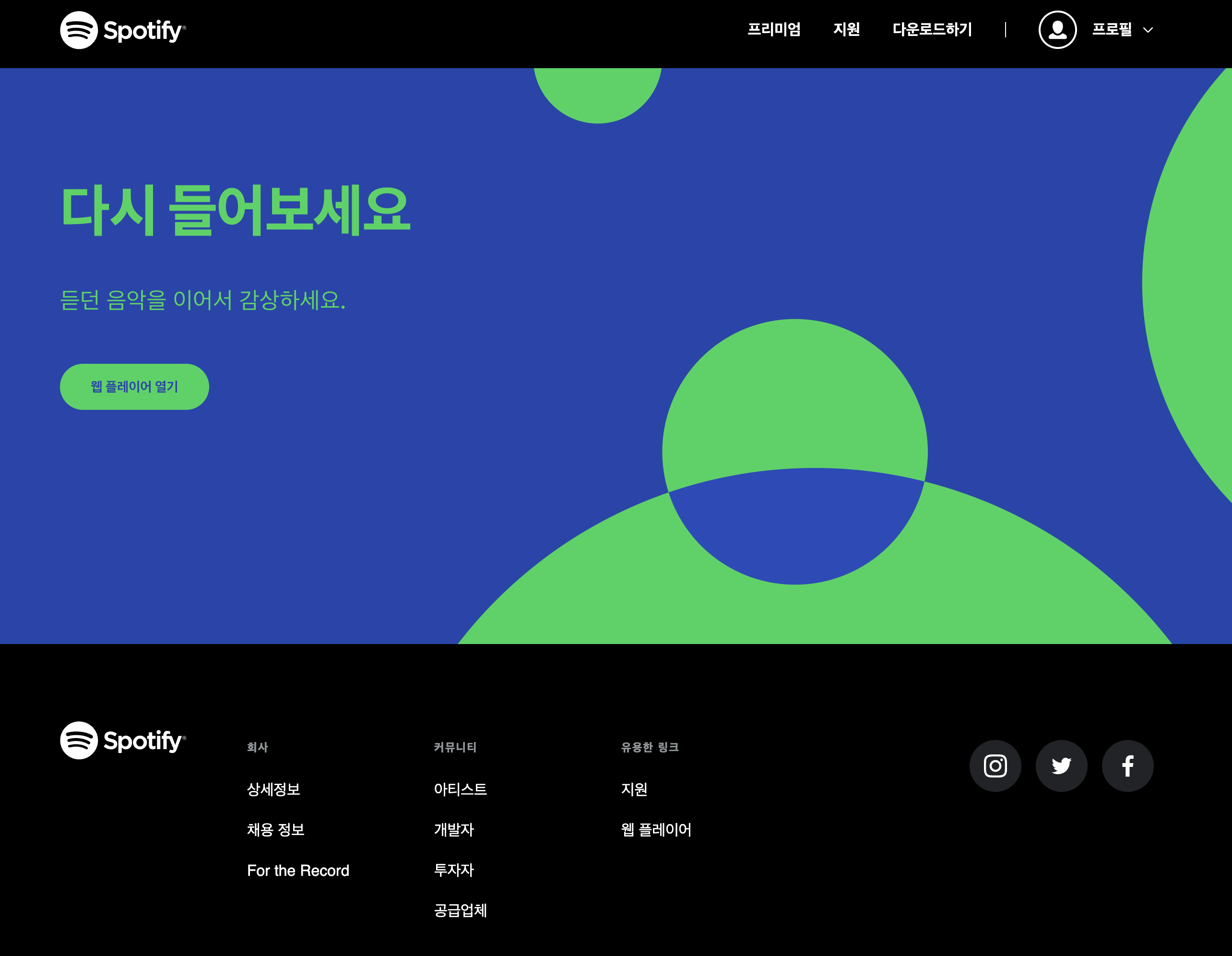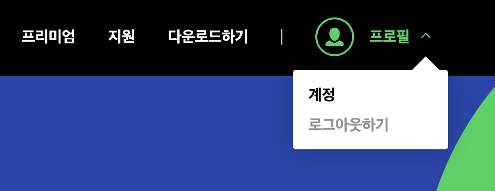 스포티파이 홈페이지 입니다. 상단에 보면 프로필 메뉴가 있습니다. 여기를 선택해서 들어갑니다.