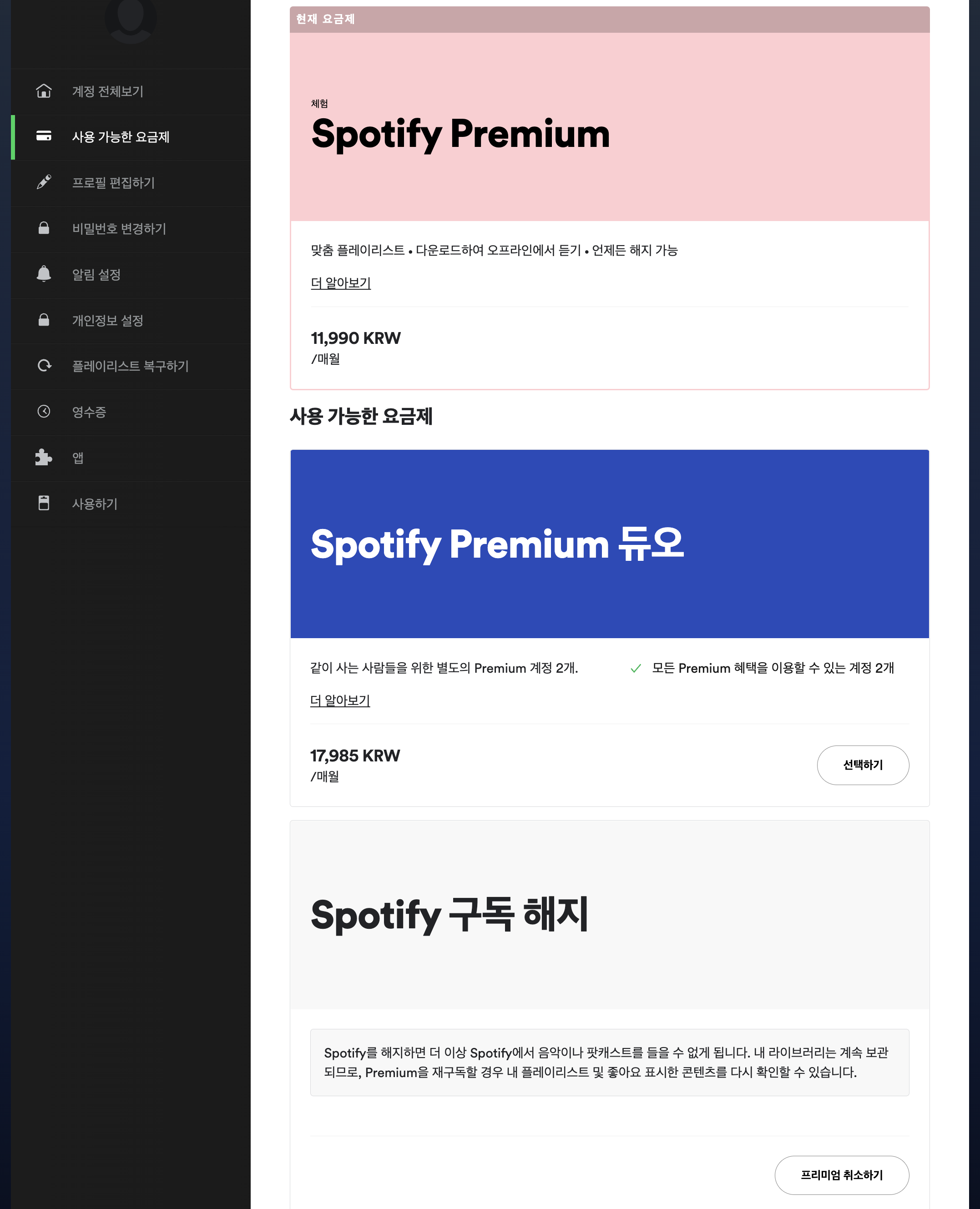 그리고 아래로 내려오면 스포티파이 구독 해지 메뉴가 있습니다. 프리미엄 취소하기를 선택하면 바로 스포티파이 해지를 할 수 있습니다.