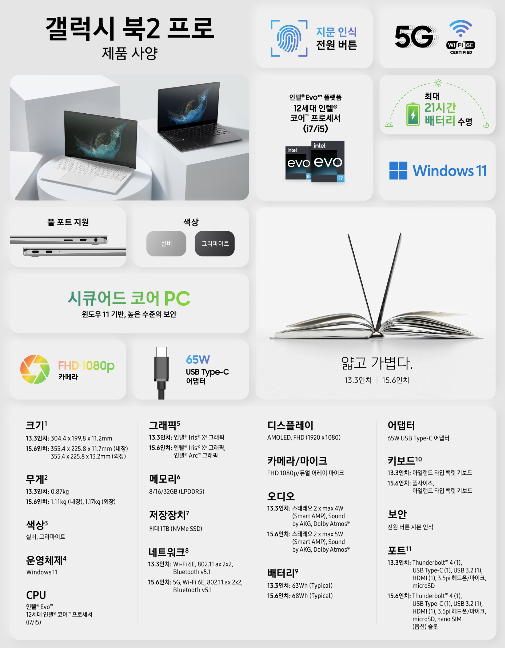 갤럭시 북 프로 13.3형 모델은 11.2mm 두께에 무게가 870g 밖에 되지 않습니다.  그리고 갤럭시 북2 프로 15.6형 외장 그래픽 제외 모델은 11.7mm 두께에 1.11kg 무게이고 외장그래픽 탑재 모델은 13.2mm 두께에 1.17kg 무게 밖에 되지 않습니다.