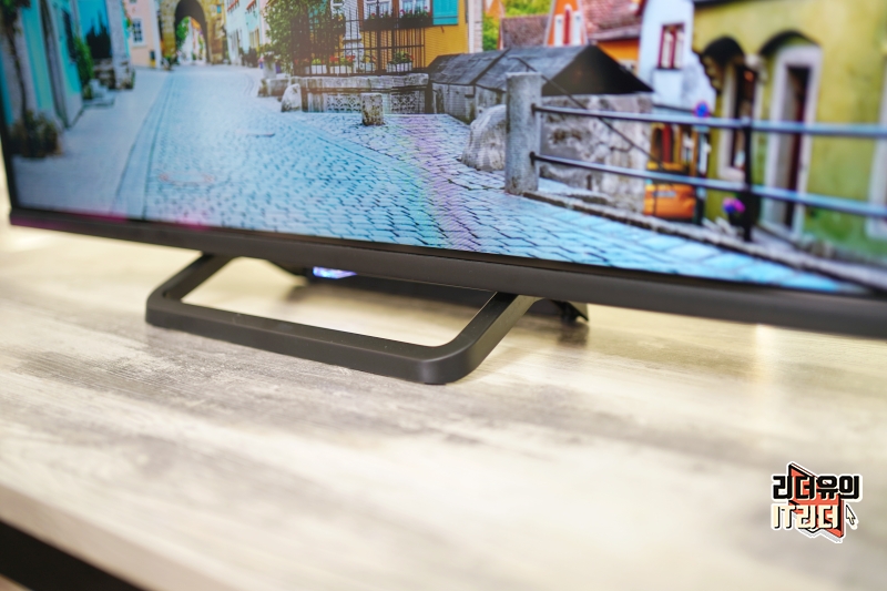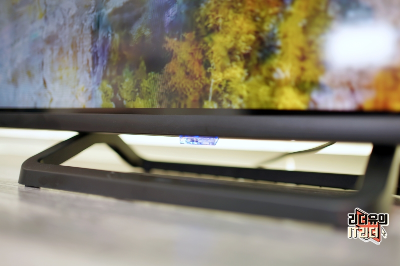 베젤은 상, 좌, 우 배젤 두께는 일정하고 하단 베젤만 살짝 더 두꺼운 디자인 입니다. 그리고 전면에 어떤 로고도 없이 깔끔한 디자인을 가지고 있습니다. 중소기업TV들도 로고를 강조하는 경우들이 많은데 없어서 더 좋다고 평가할 수 있습니다.