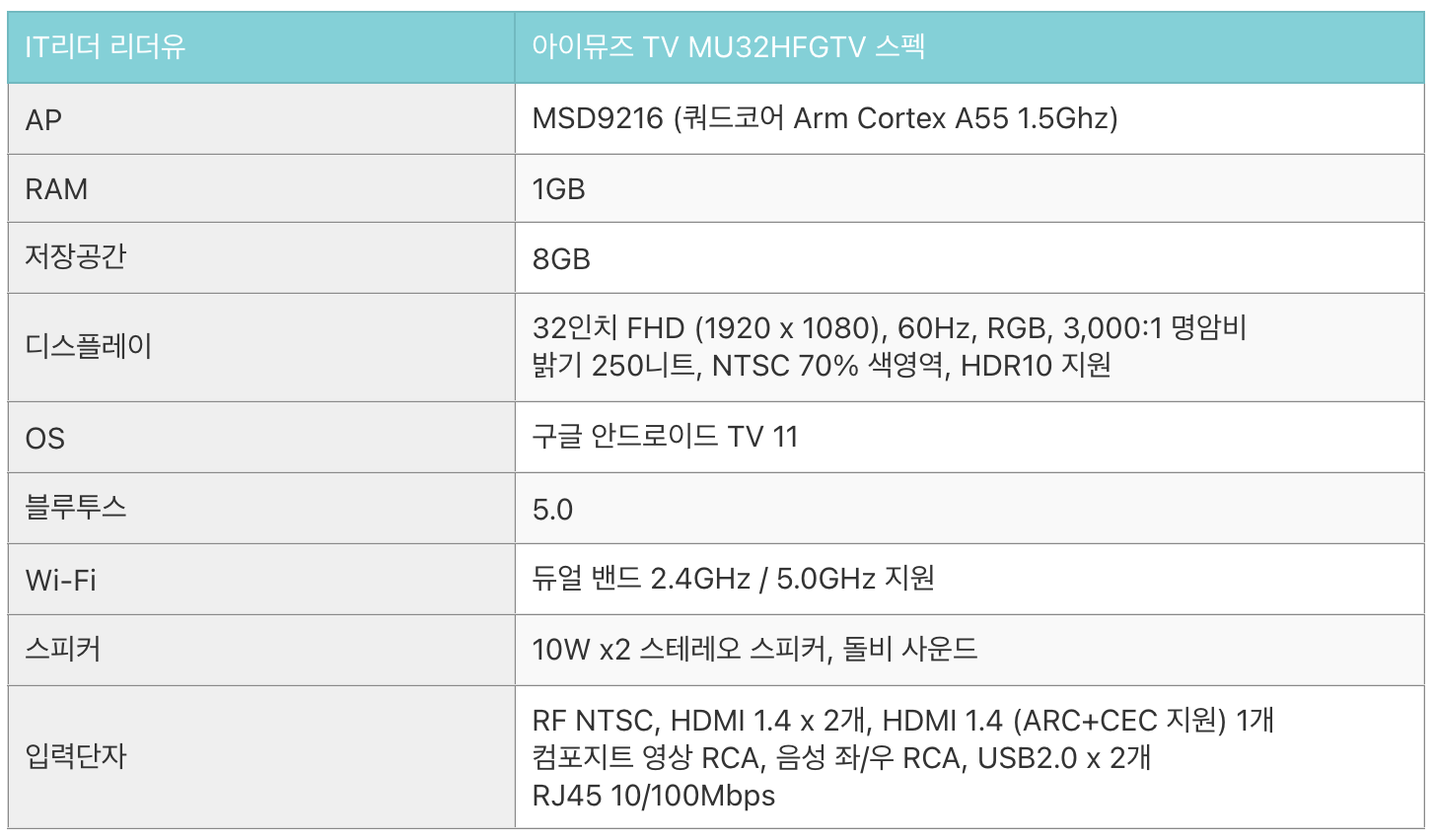 아이뮤즈 TV MU32HFGTV 는 안드로이드 태블릿 TV이니 스펙이 중요하겠죠. AP, RAM, 저장공간은 일반적인 태블릿PC에 비하면 안좋은 스펙이지만 스마트 TV로서의 스펙이면 준수한 수준입니다. TV로 사용하는 제품이기 때문에 충분히 빠른 컨트롤이 가능하고 풍부한 연결성도 지원하니 만족스럽게 사용이 가능합니다.