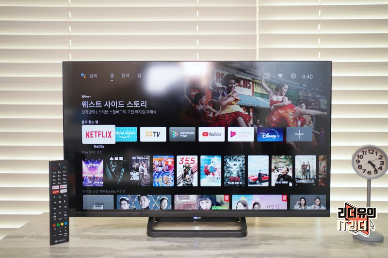 그리고 리모컨 디자인도 깔끔하고 세울 수 있게 디자인 되어 거치와 사용성이 좋습니다.