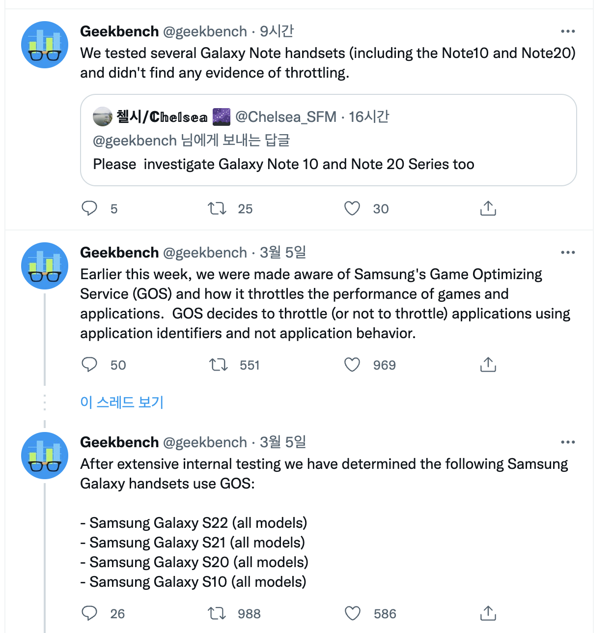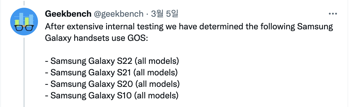 삼성전자 갤럭시S22 시리즈 GOS (Game Optimiznig Services)사건이 점점 커지고 있습니다. 국내 뿐만 아니라 전세계적으로 이슈가 되고 있는데요. 더욱 망신스러운 것은 벤치마크 성능을 평가하는 긱벤치에서 이를 공식적으로 확인했고 퇴출하기로 공식적인 발표를 했습니다.