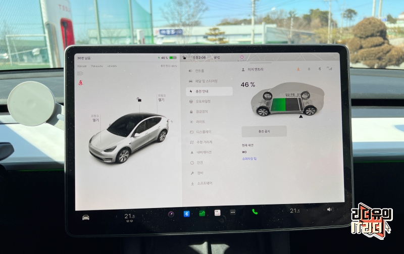 테슬라 모델Y 디스플레이에서 충전 상황을 알 수 있습니다.