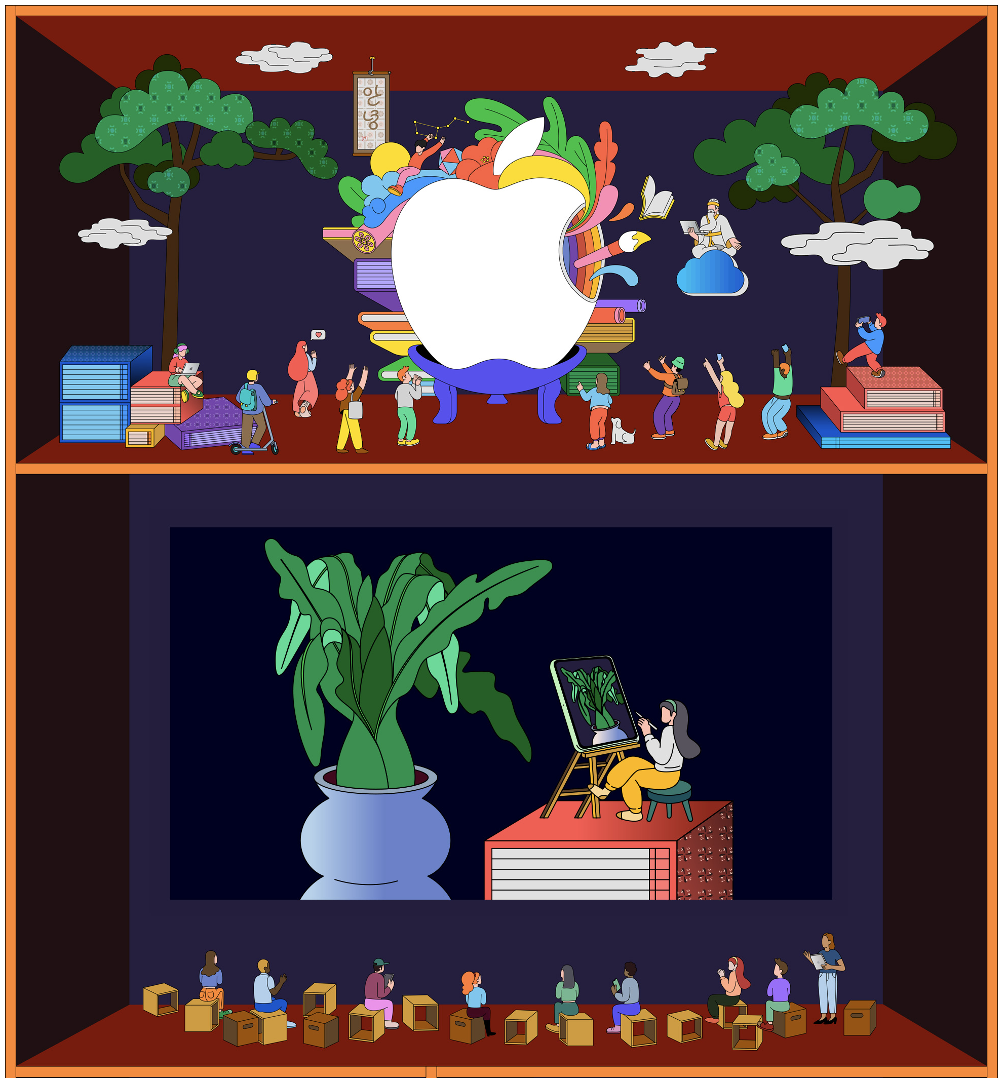 특히 애플만의 특징을 살려 책가도 각 칸에는 창의성을 뽐내고 있는 사람들과 애플의 제품과 서비스를 통해 서로 소통하는 에너지가 넘치는 모습을 재현하고 있습니다.