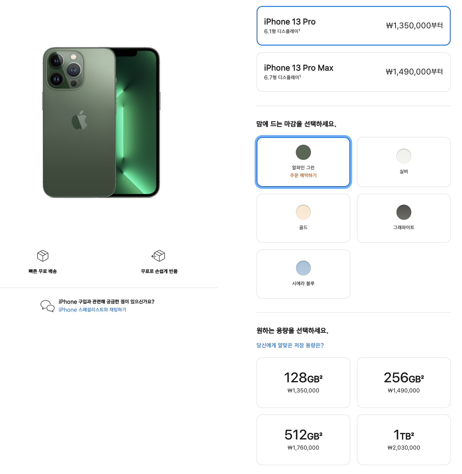 새로운 알파인 그린 색상은 아이폰 13 프로, 아이폰13 프로 맥스에 특화된 색상이고 가격은 아이폰 13 프로는 1,350,000원 부터 시작하고 아이폰 13 프로 맥스는 1,490,000원 부터 시작합니다. 가격 변동은 없으니 참고하시고요. 사이즈와 용량만 고민하셔서 선택하시면 됩니다.
