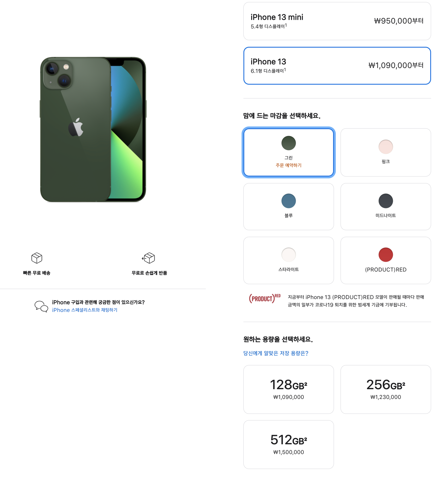 새로운 색상 그린은 아이폰13, 아이폰 13 미니에만 적용되는 색상입니다. 아이폰13 미니 가격은 950,000원 부터 시작하고 아이폰13은 1,090,000원 부터 시작합니다. 마찬가지로 가격 변동은 없으니 참고해 두시고요. 사이즈와 용량만 고민하셔서 선택하시면 됩니다.