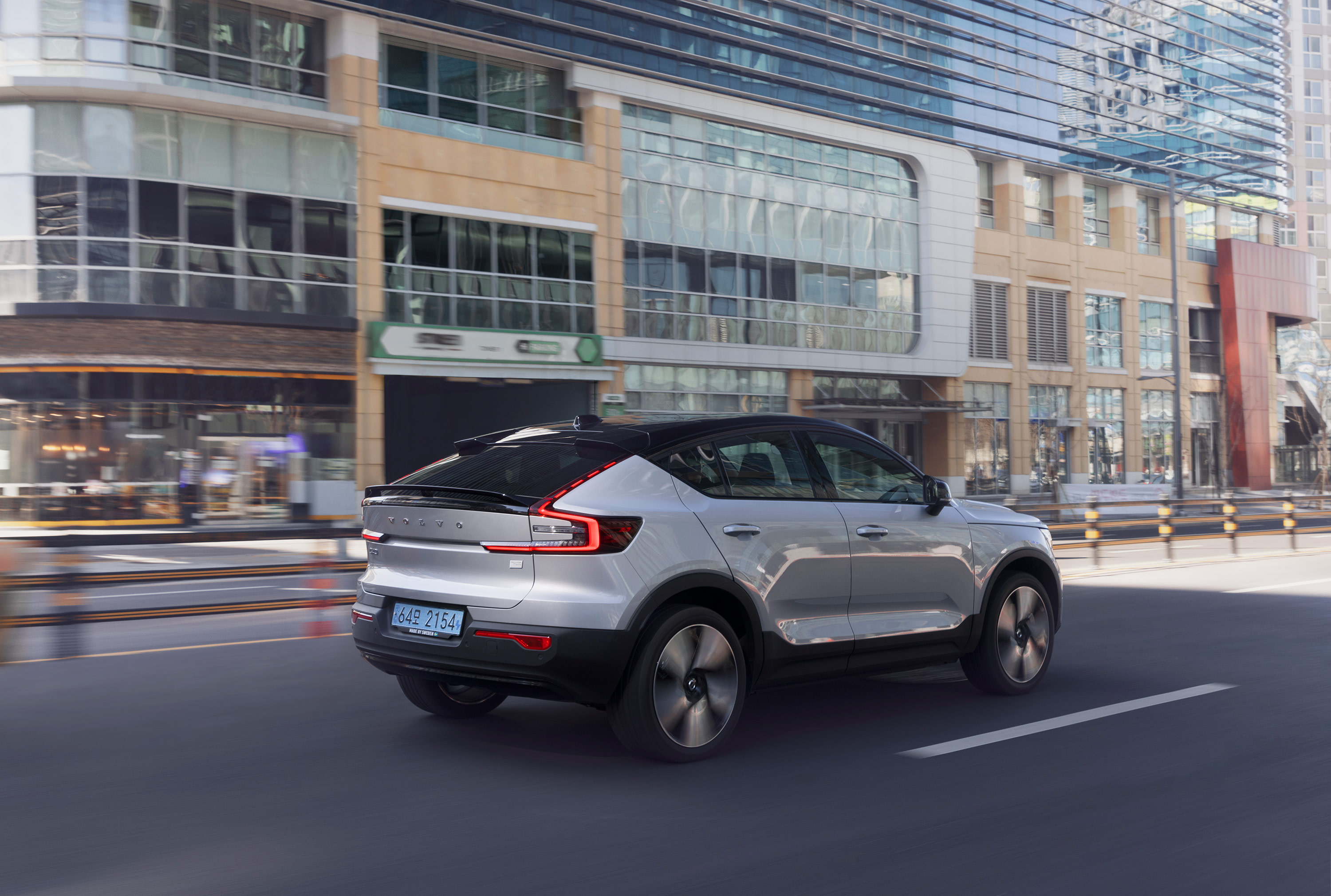 달리는 모습도 멋진 볼보 C40 리차지 전기차 입니다. 쿠페형 SUV라 역동적인 라인이 아름답고 스포티한 디자인을 느낄 수 있습니다.