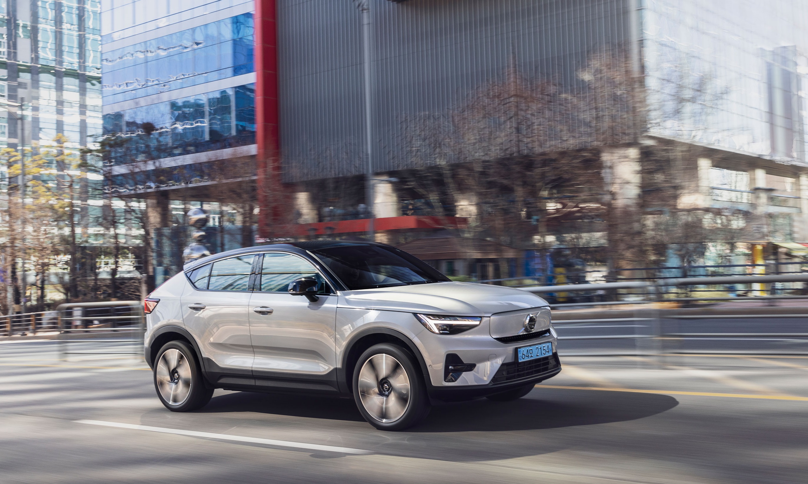 달리는 모습도 멋진 볼보 C40 리차지 전기차 입니다. 쿠페형 SUV라 역동적인 라인이 아름답고 스포티한 디자인을 느낄 수 있습니다.