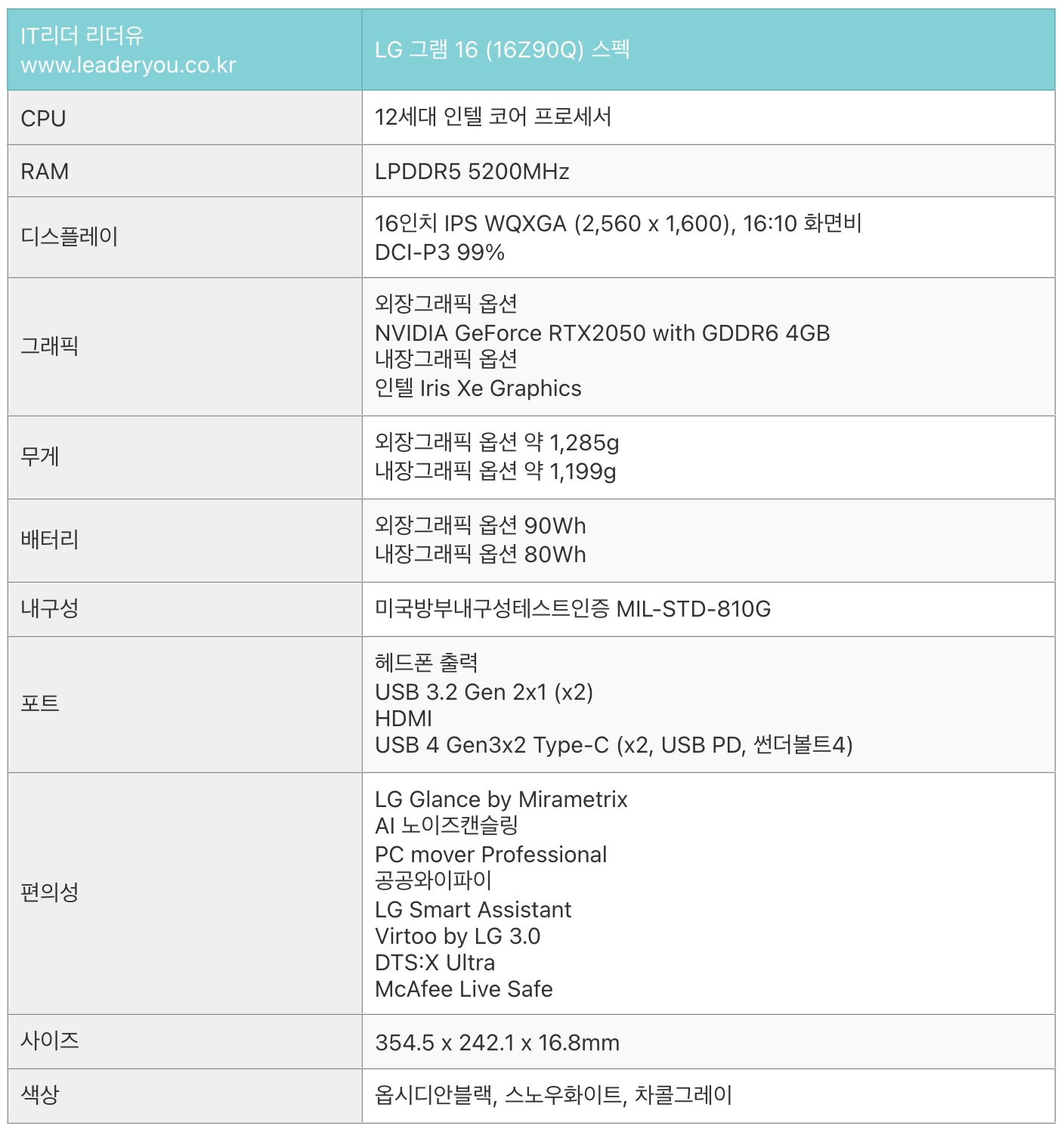 참고로 LG 그램 16 16Z90Q 스펙은 다음과 같습니다.