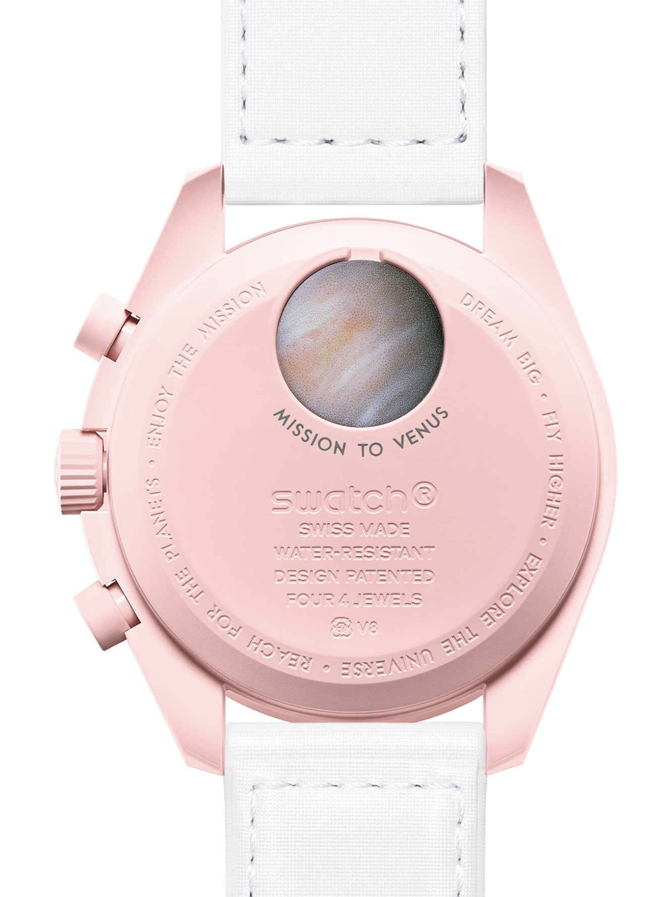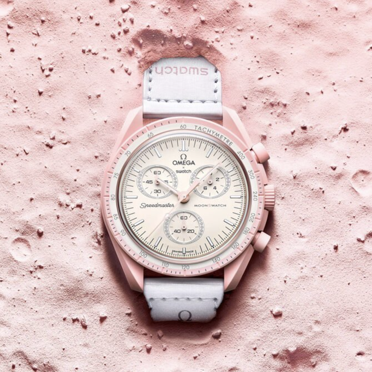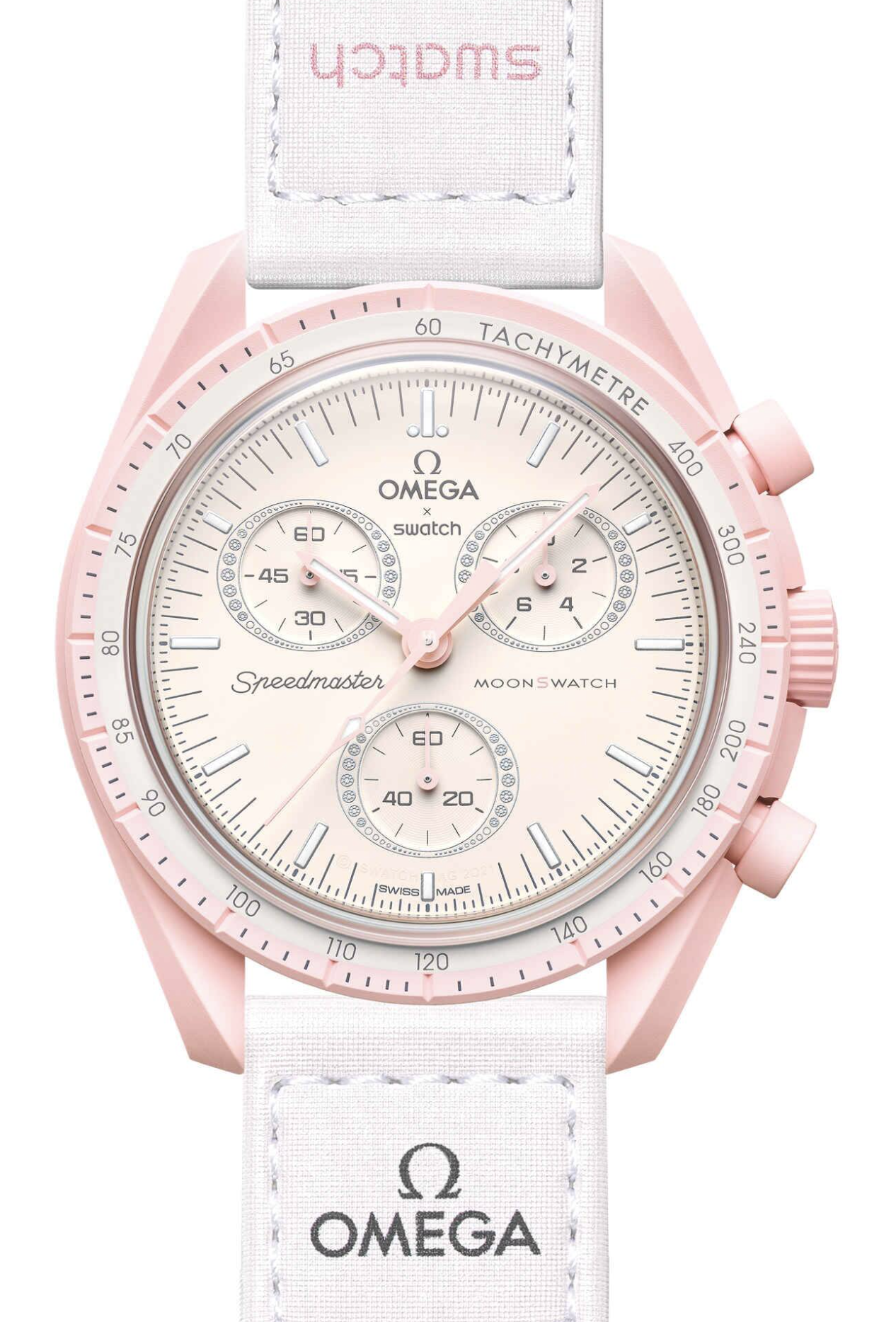그리고 시계 내부 디자인도 각 컨셉에 따라 모양이 다르게 들어가 있습니다. 핑크빗한 느낌에 어울리는 보석같은 디자인이 적용된 스와치 오메가 콜라보 문스와치 입니다.