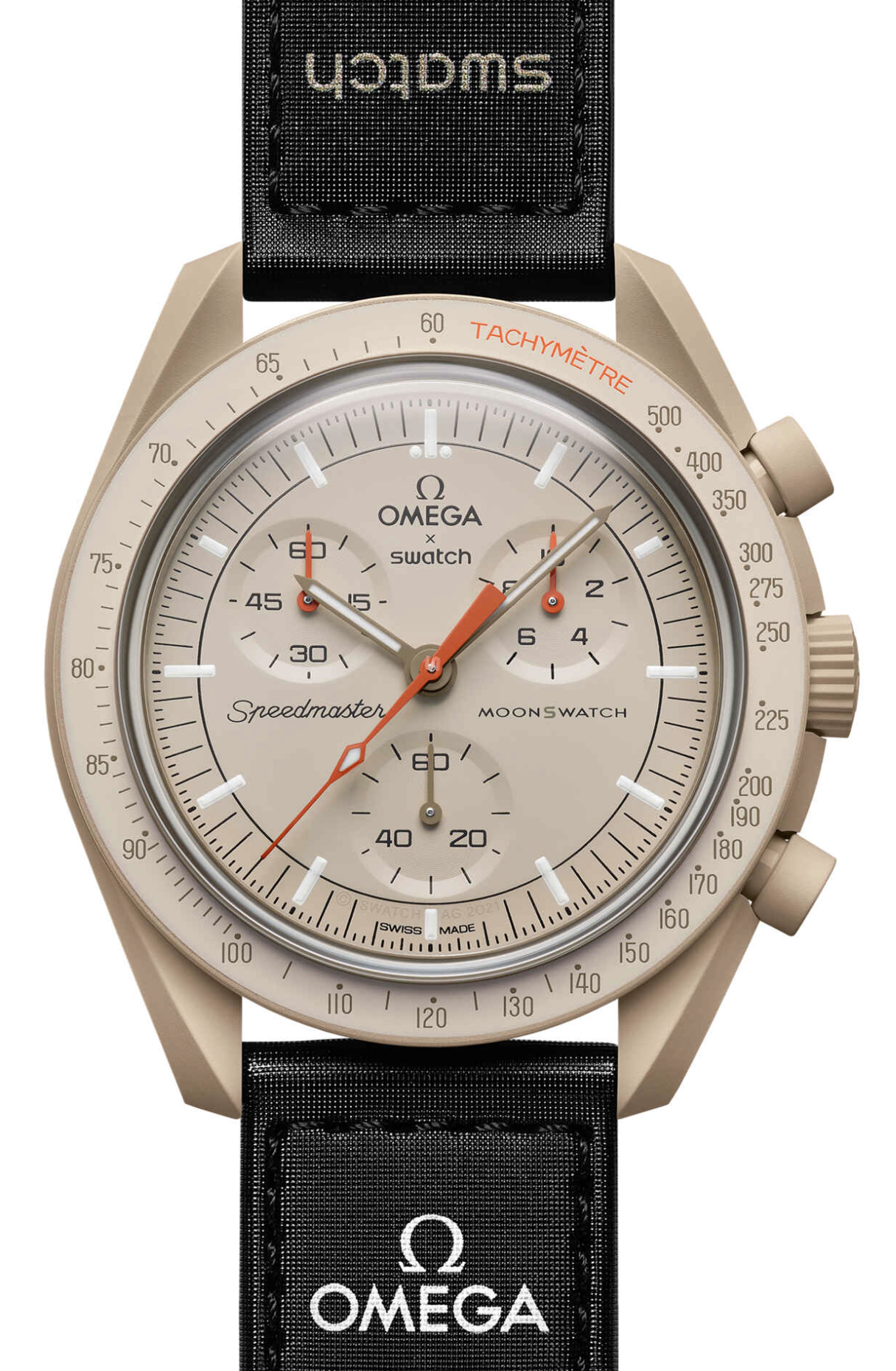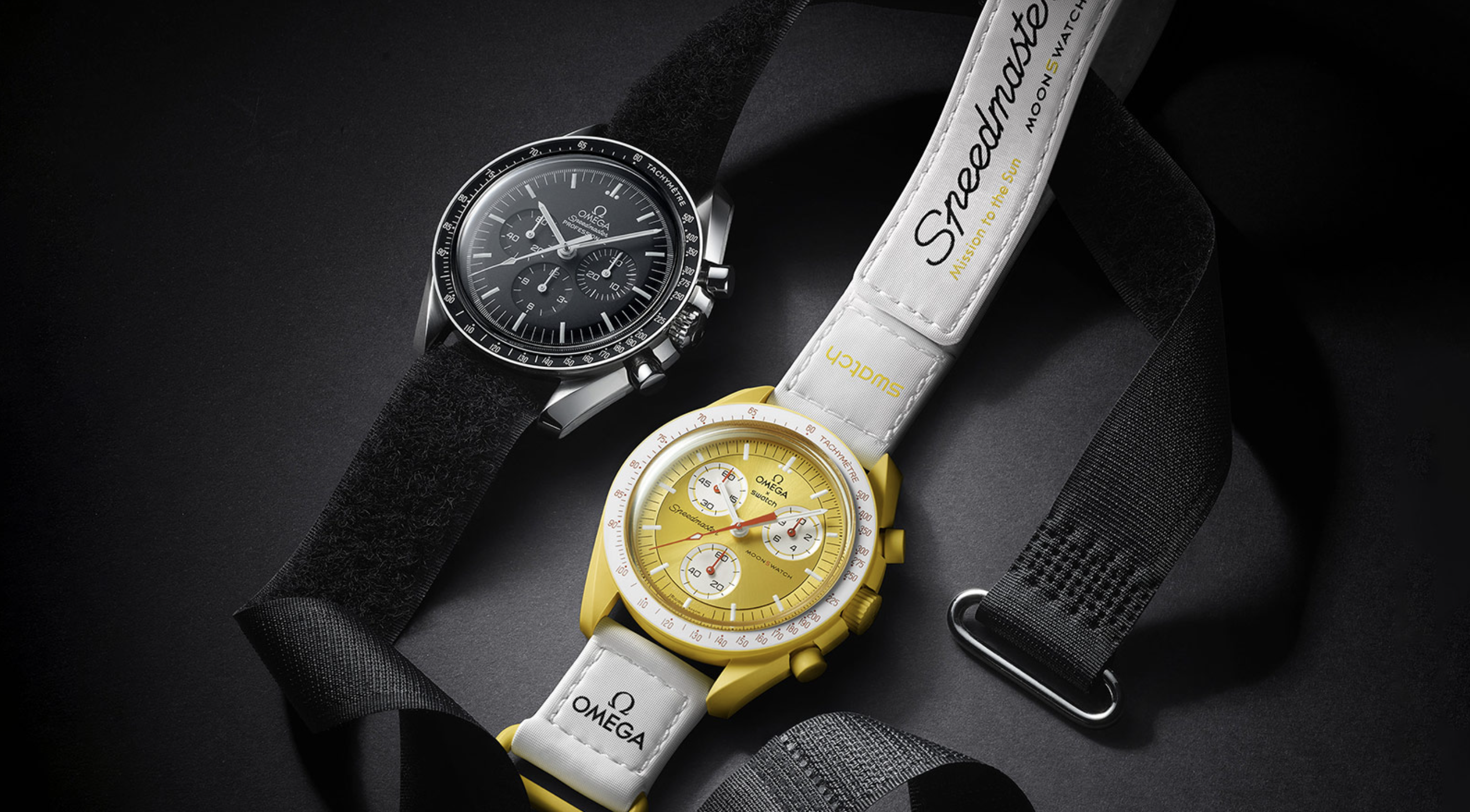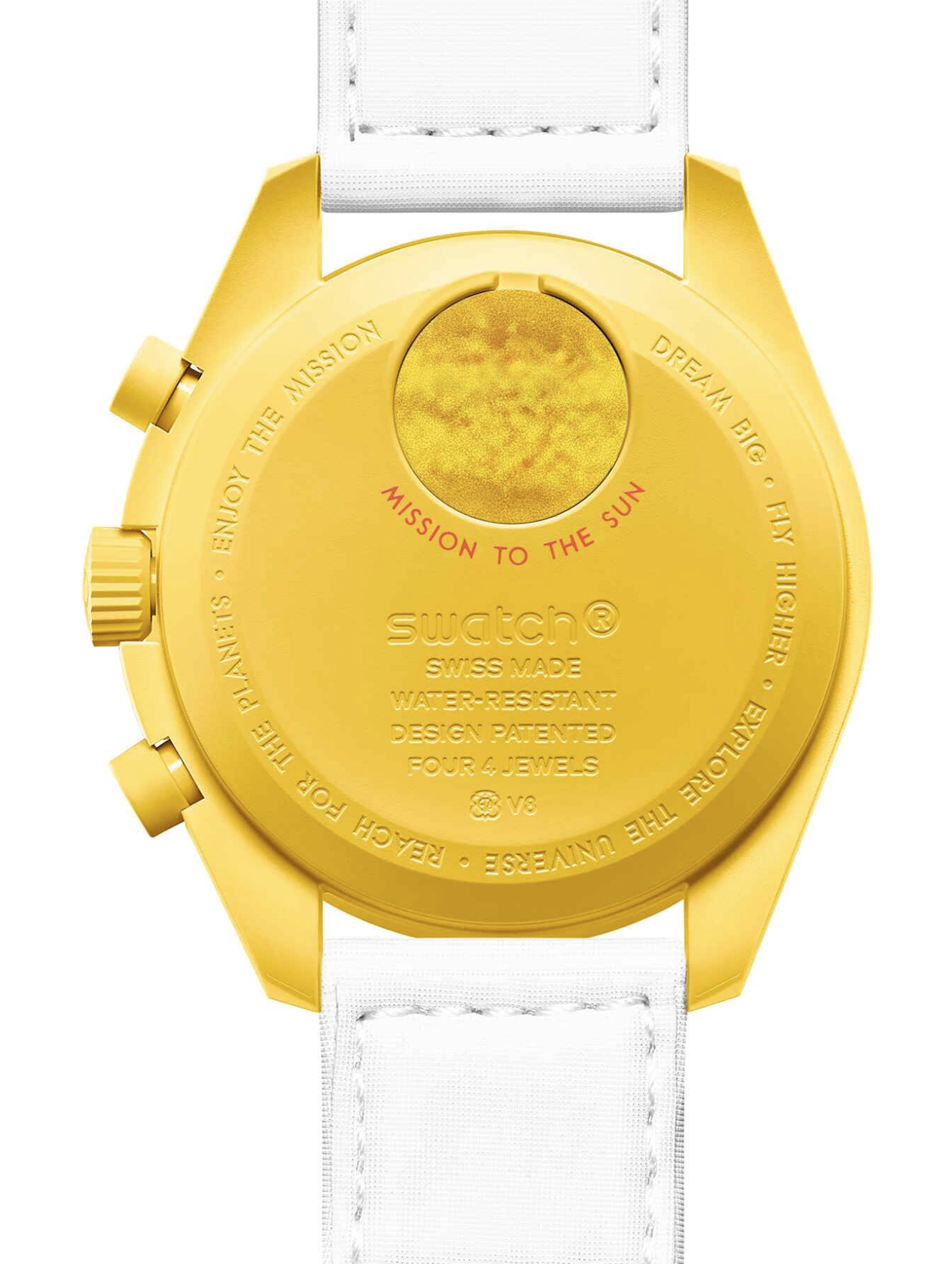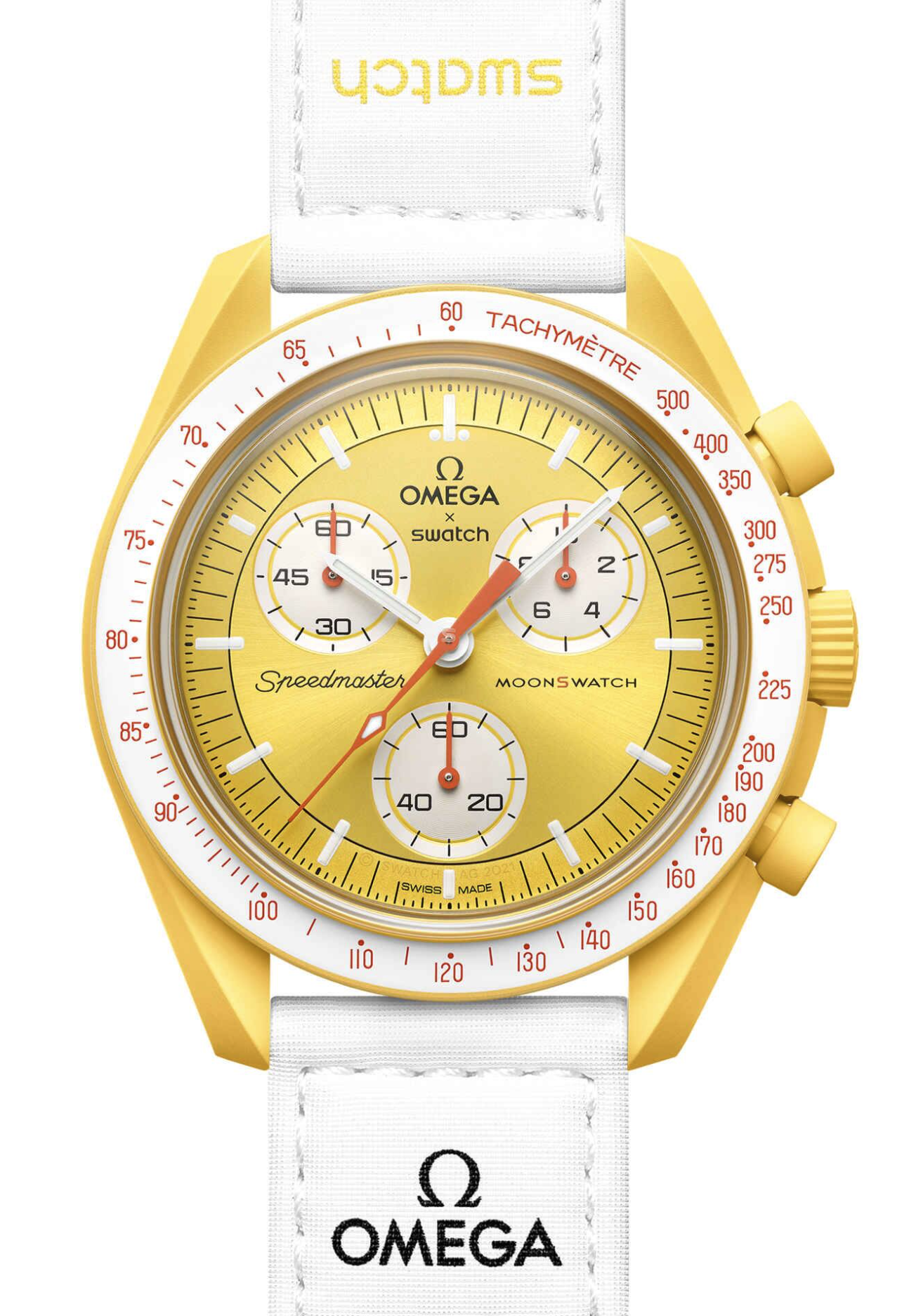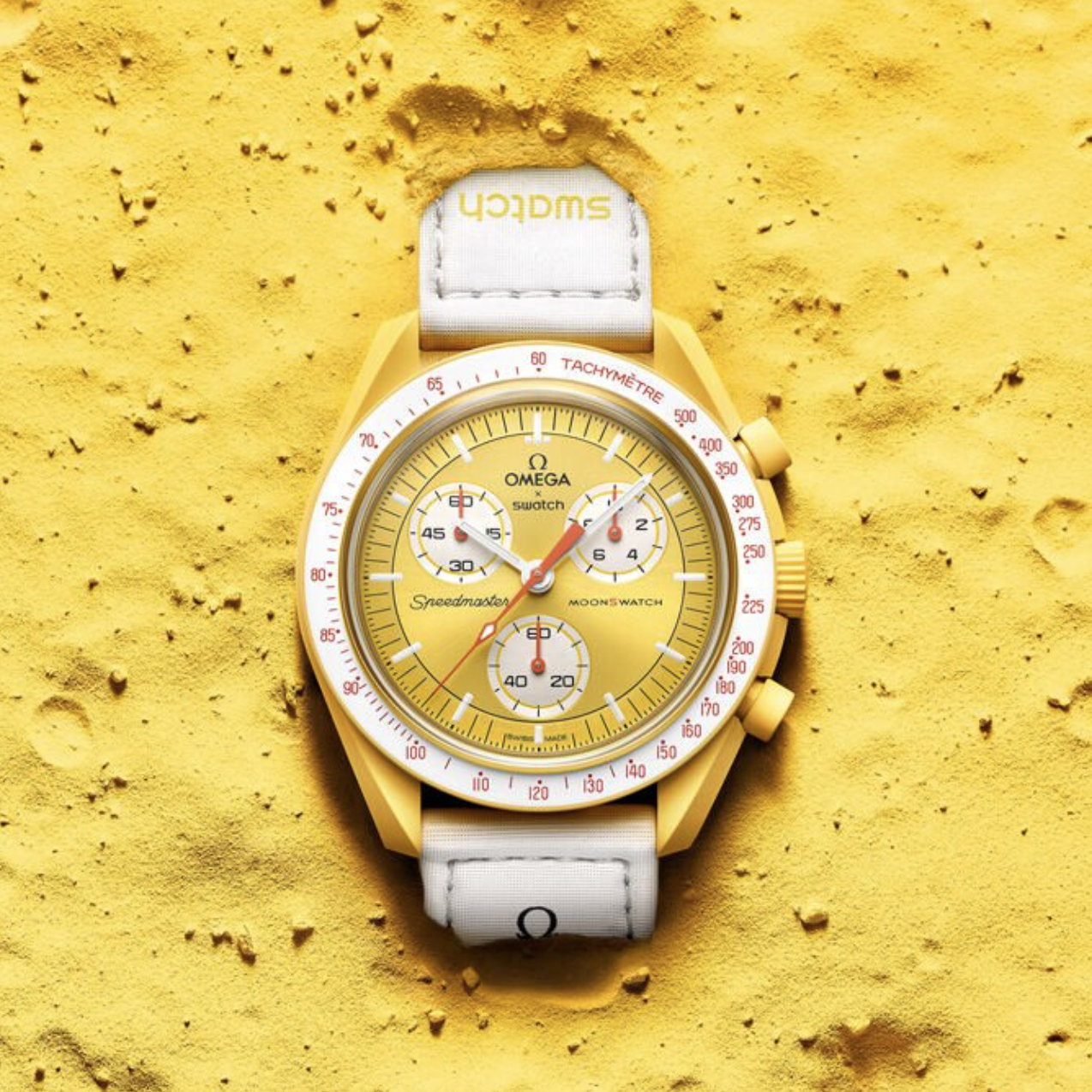 태양을 모티브로 한 문스와치입니다. 태양의 노란색을 강조한 디자인을 보여주고 있고 오메가 브랜드와 스와치가 함께 했음을 다양하게 보여주고 있습니다. 그리고 시계 안에는 스피드마스터라고 쓰여 있고 문스와치라는 것을 강조해서 보여주고 있습니다.