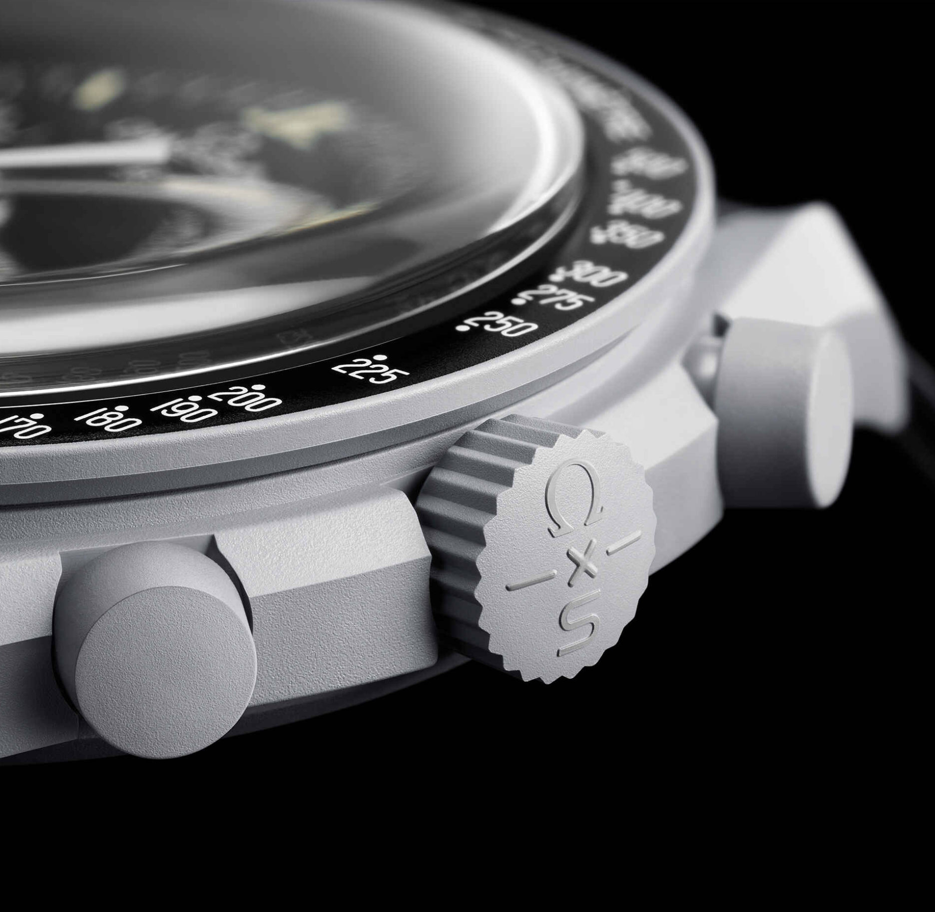용두에도 스와치 오메가를 상징하는 브랜드 로고가 새겨져 있습니다.