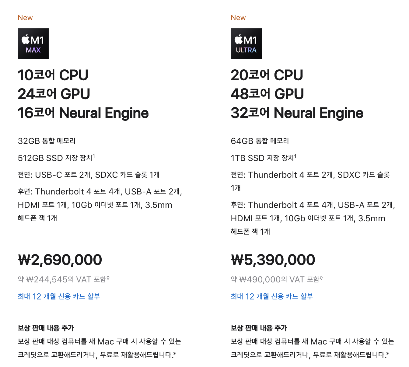 애플 맥 스튜디오는 M1 max, M1 Ultra를 선택할 수 있습니다. M1 Max가 적용된 모델은 10코어 프로세서를 탑재해 가장 빠른 아이맥 27 대비 2.5배나 빠른 CPU 성능이고 16코어 Xeon 프로세서를 탑재한 맥 프로 대비 최대 50% 빠른 CPU 성능을 가지고 있습니다.