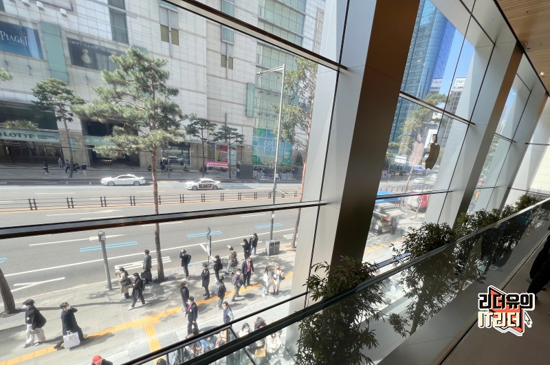 그리고 애플 명동은 처음으로 수평 지탱 구조의 더블하이트 유리 전면을 갖추고 있습니다. 2개층 높이를 통으로 유리로 구성해 정말 압도적인 전경을 보여주고 있습니다.