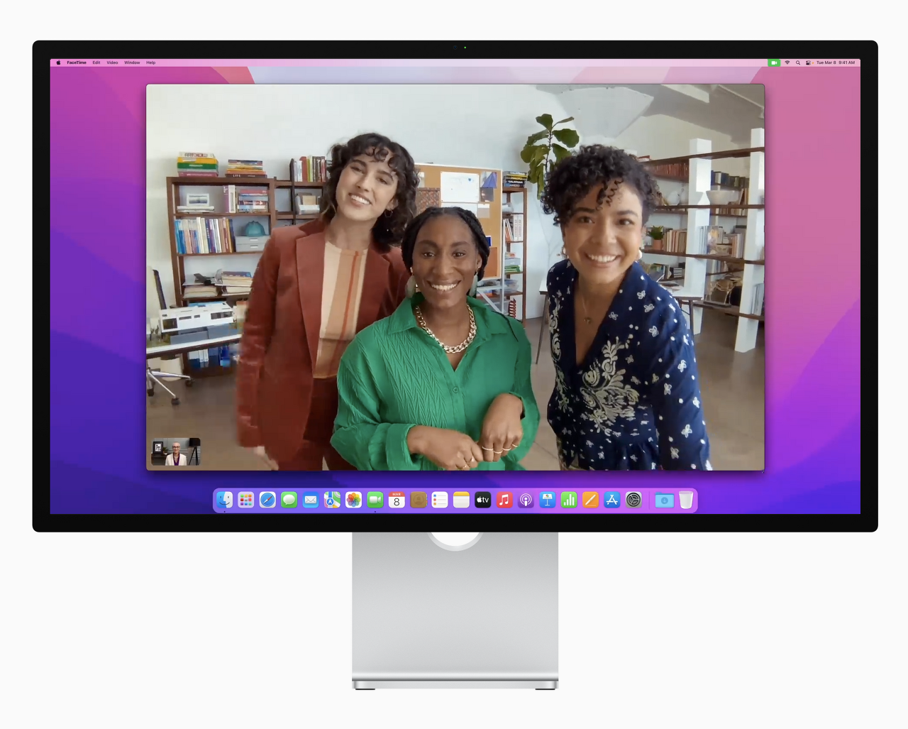 애플 스튜디오 디스플레이에는 아이패드에 들어가고 있는 센터 스테이지 기술이 적용된 1200만 화소 울트라 와이드 카메라가 들어가 있습니다. 사용자가 움직이더라도 자동으로 패닝해 중심을 잡아주고 여러사람들이 포착되면 그거에 맞게 자동으로 맞춰주는 기능입니다.