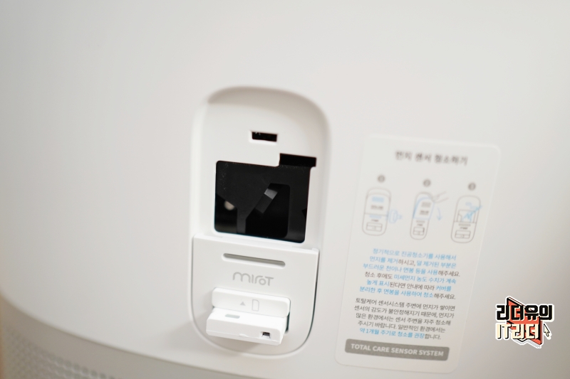 토탈케어 센서는 이렇게 커버를 열어 청소를 할 수 있습니다. 정기적으로 진공청소기를 사용해서 먼지를 제거하고 덜 제거된 부분은 부드러운 천이나 면봉 등을 사용해 청소를 해주면 됩니다. 센서 청소를 안하면 센서의 감도가 불안정해지니 약 1개월 주기로 청소를 권장하고 있습니다.