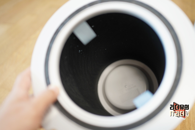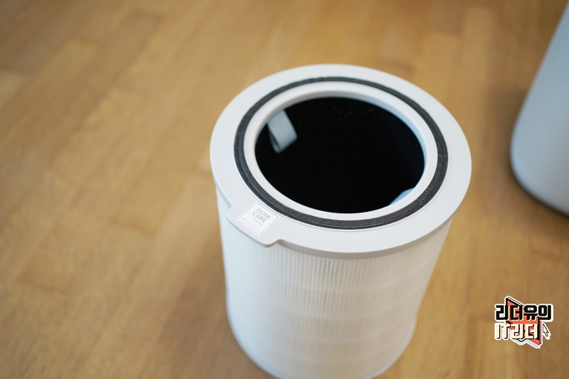 미로 맑음 공기청정기는 최초 사용시 내부 필터 비닐을 제거해 줘야 하는데요. 본체가 2단으로 분리가 되는 구조라 쉽게 필터 교체 관리를 할 수 있습니다. 상단부를 들어내면 안쪽에 비닐로 감싸진 미로 맑음 필터를 확인해 볼 수 있습니다.