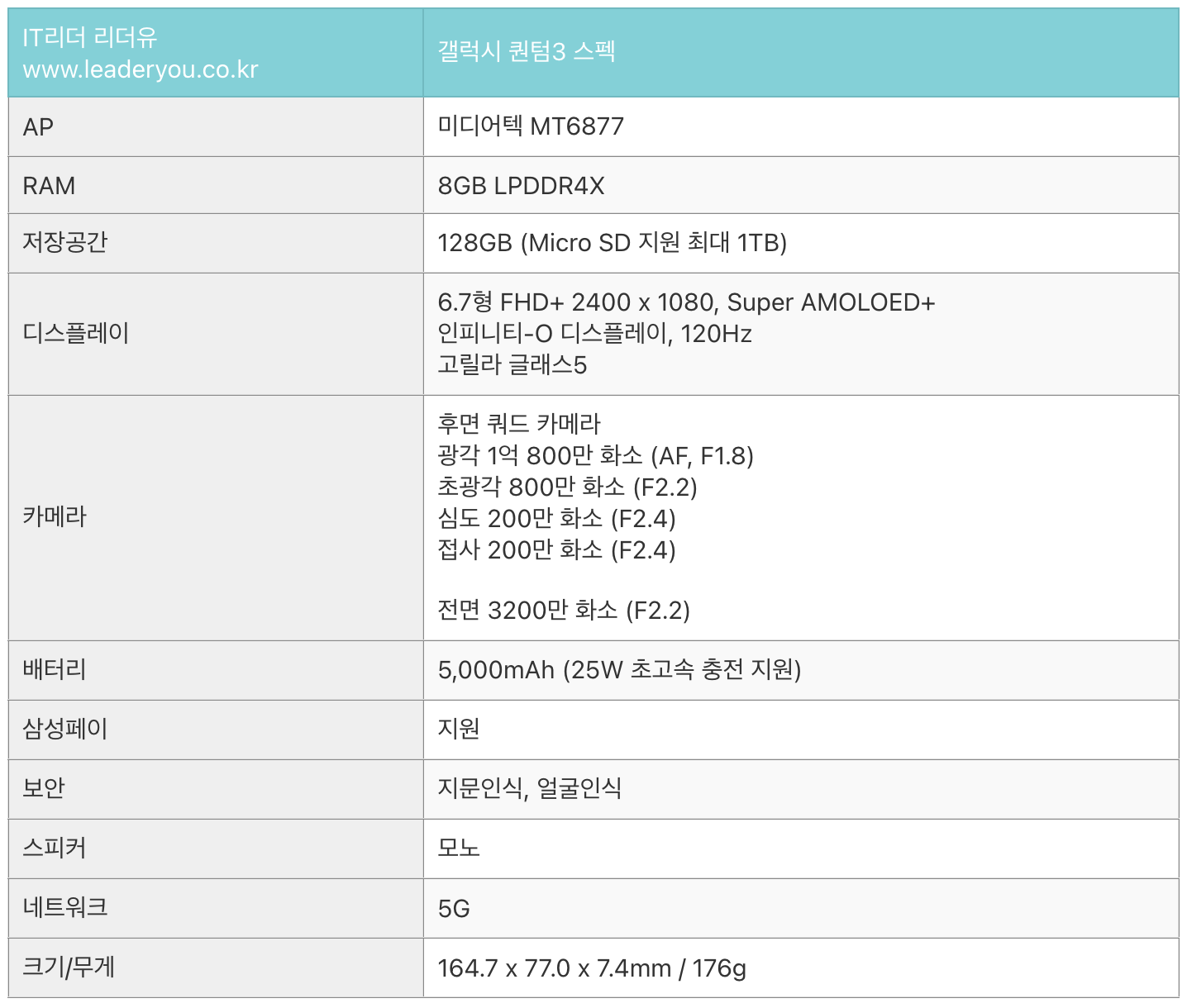 스마트폰을 선택할 때 아무래도 스펙과 성능적인 부분을 고려할 수 밖에 없는데요. SKT 갤럭시 퀀텀3 5G 스펙은 다음과 같습니다.