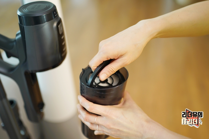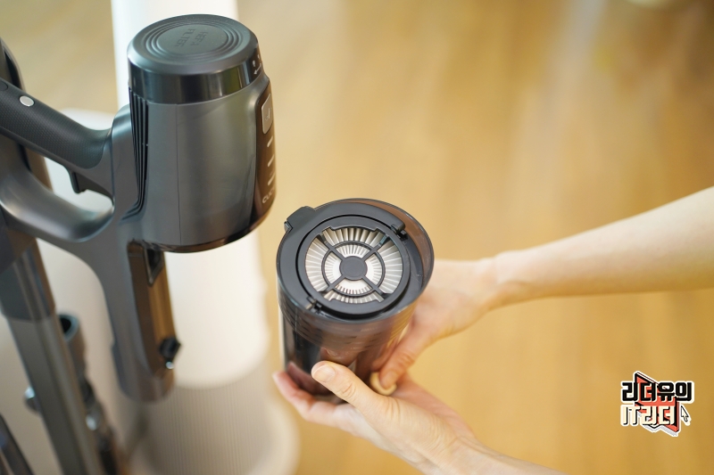 그리고 먼지통을 분리하면 위쪽에 프리필터를 분리하고 먼지통을 비울 수 있습니다. 먼지통에 모인 먼지가 2차 오염 되지 않도록 안전하게 보호를 하고 있습니다.