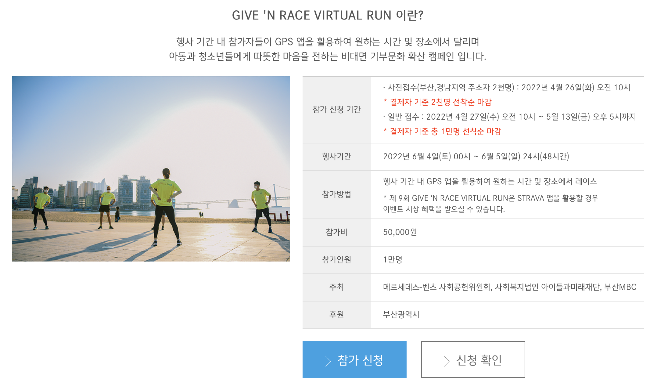 2022년 메르세데스 벤츠 기브앤 레이스 접수는 사전 접수로 부산, 경남지역 주소자 2천명을 먼저 받고 일반접수로 총 1만명을 선착순으로 받습니다.