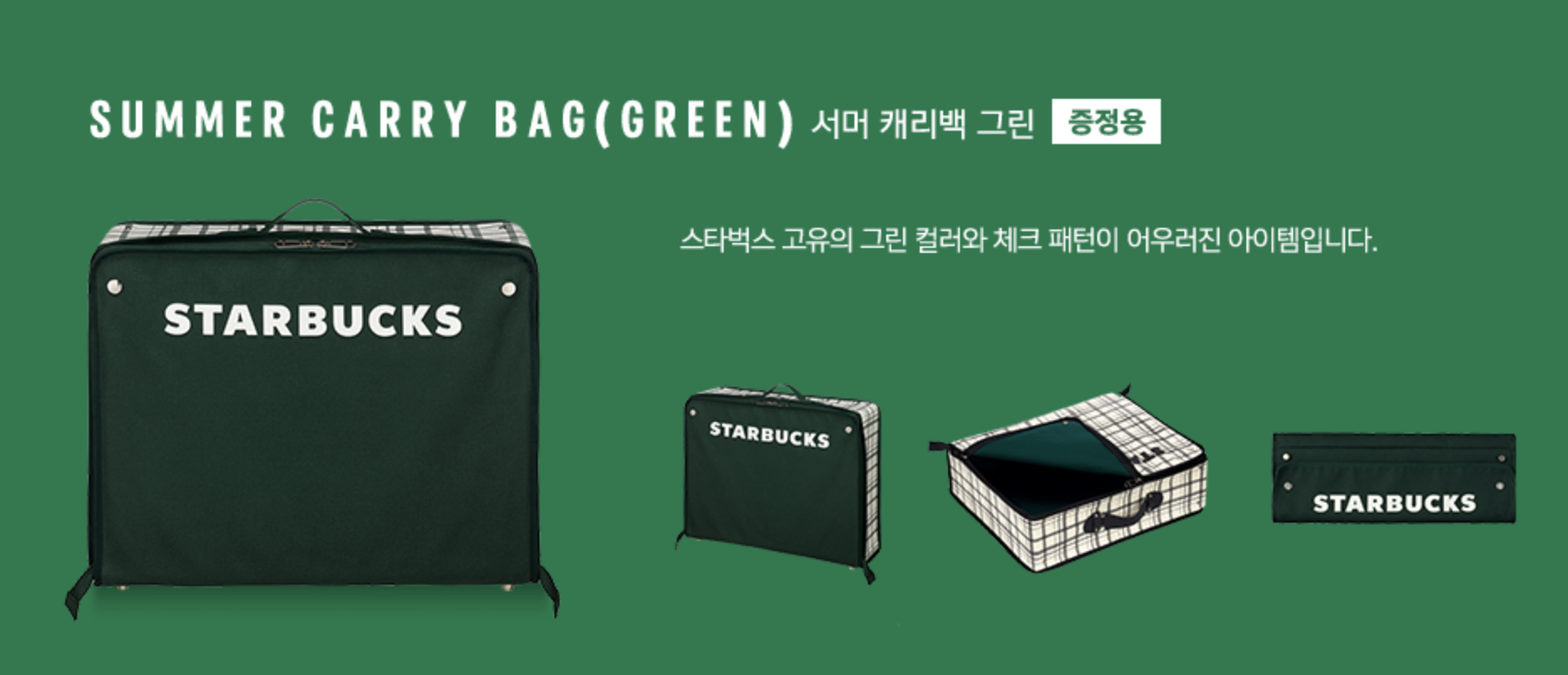 스타벅스 서머 캐리백은 여행용 짐을 쌀 수 있는 가방으로 레드, 크림, 그린 색상으로 준비되어 있습니다. 재질은 천이고 최대 적재하중은 4kg 정도로 간단한 짐을 넣어 다닐 수 있을 것 같습니다. 디자인이 예뻐서 꽤 좋은 반응이 예상됩니다.