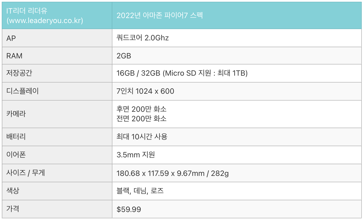 2022년 새롭게 출시된 아마존 파이어7 가격은 $59.99 (한화 약 76,000원) 입니다. 7인치 태블릿PC가 8만원이 안된다니 정말 놀랍죠!