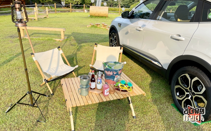 르노코리아 XM3 차박 세팅의 완성은 옆에 그늘막을 치는 것입니다. 텐트 없이도 텐트 분위기 내고 아래에는 테이블과 의자를 두고 낭만적인 시간을 보낼 수 있습니다.