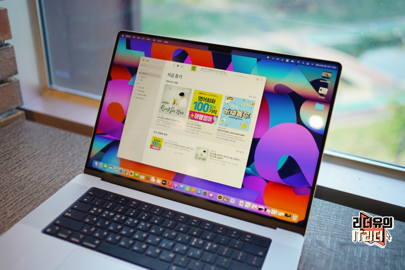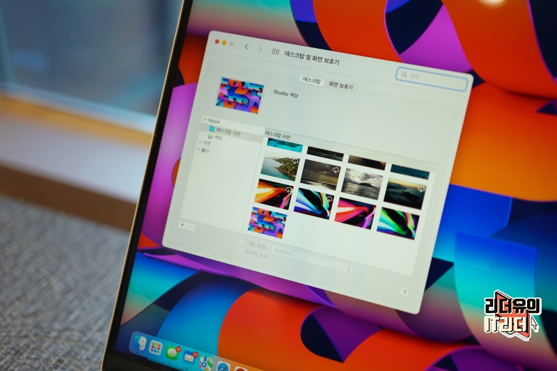 기분전환으로 M1 Pro 맥북프로 16인치에 새로운 애플 스튜디오 디스플레이 배경화면을 적용한 모습입니다. 산뜻하니 예쁘죠? 배경화면만 바꿔도 새로운 노트북을 산 느낌이니 여러분도 변경해 보세요.