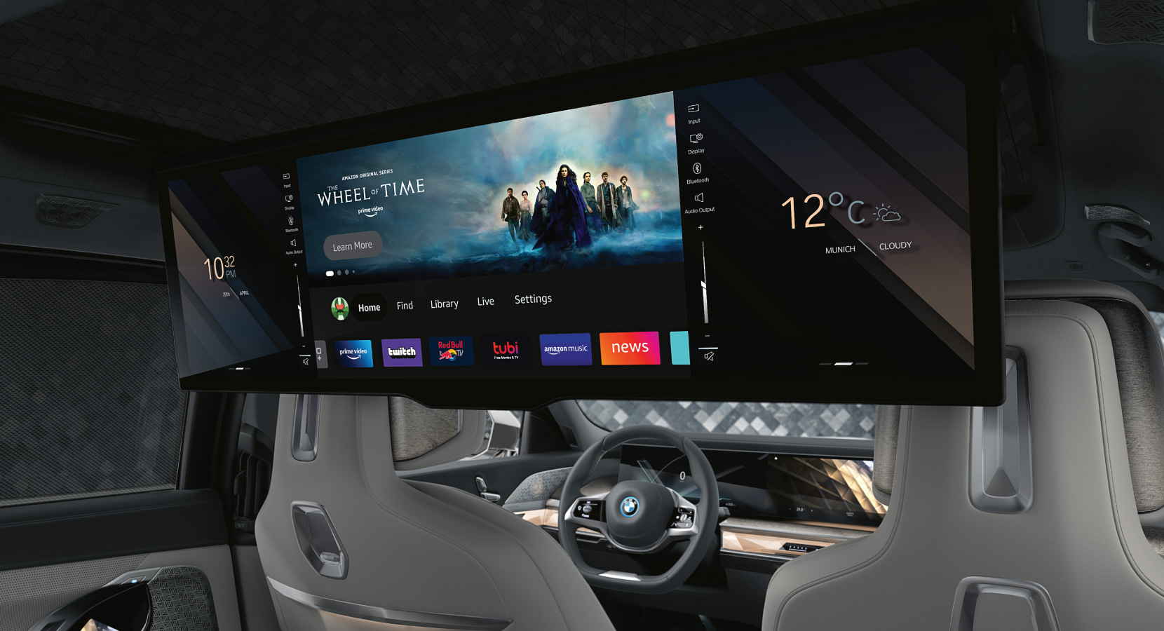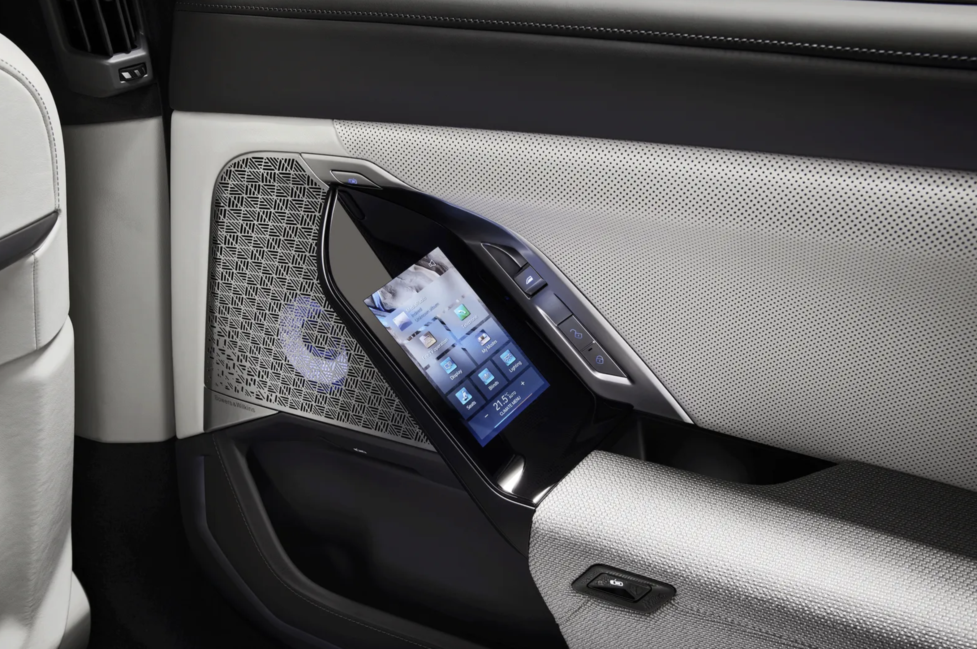 그리고 루프 상단에 31인치 8K 디스플레이를 탑재했습니다. 아마 모두가 꿈꿔왔던 기능이 아닐까 하는데요. 뒷자리에서 극장처럼 이용할 수 있게 하는 기능입니다. 다양한 OTT 서비스를 지원한다고 하니 기대가 되는 기능입니다. 그리고 32개 스피커를 탑재해 웅장한 사운드를 들을 수 있습니다. Bowers & Wikins 서라운드 사운드 시스템으로 적용되어 있습니다.
